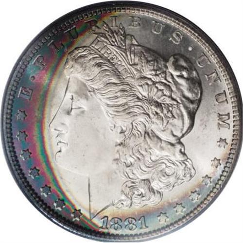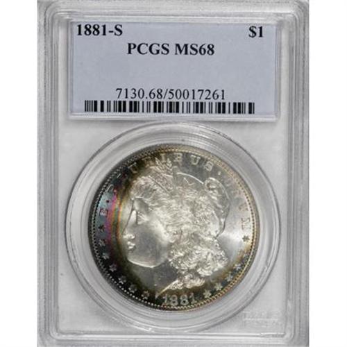 <B>1881-S $1 MS68 PCGS.</B></I> Bands of cherry-red, forest-green, peach, and powder-blue toning endow the obverse periphery. The reverse shows only a brief blush of golden toning near 1 o'clock. This exquisitely struck Superb Gem is uncommonly void of marks, even for an 1881-S, which often comes nice. Those who wish only the finest quality within their holdings should consider the present piece. Population: 80 in 68, 2 finer (8/07).<BR><BR><B>Coin Engraver:</B> George T. Morgan<BR><BR><b>Shipping:</b> Coins & Currency (<a target="_blank" href="http://www.heritageauctions.com/common/shipping.php">view shipping information</a>)