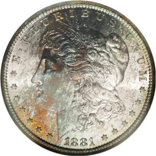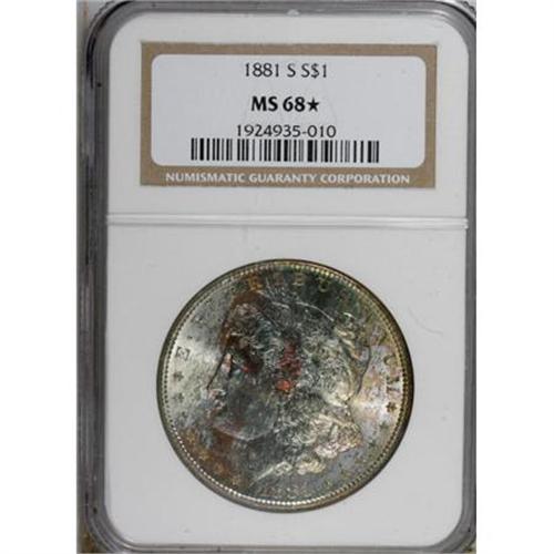 <B>1881-S $1 MS68 <img border='0' src='http://www.heritagecoins.com/images/star.gif' width=10 height=10> NGC.</B></I> Splashes of aquamarine, peach, gold, and rose-red adorn the obverse of this needle-sharp silver dollar. The reverse is only lightly toned, although the upper border has lemon and pink shades. Occasional minor contact cannot deny the eye appeal of this attractive silver type coin.<BR><BR><B>Coin Engraver:</B> George T. Morgan<BR><BR><b>Shipping:</b> Coins & Currency (<a target="_blank" href="http://www.heritageauctions.com/common/shipping.php">view shipping information</a>)