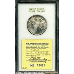 <B>1881<S$1> Morgan Dollar MS65 MTB Banking Corporation (MS64).</B></I> A sharply struck, lustrous, and unabraded piece with mottled peach, navy-blue, and russet patina. A fingerprint on the lower right reverse does not distract. <BR><BR><B>Important notice:</B> Heritage usually auctions material at the rate of 200-250 lots per hour. On some occasions eBay Live bid software or the Internet may not be able to keep up with the pace of the auction. We recommend placing a realistic absentee bid now as insurance to avoid disappointment. Occasionally the auctioneer may eliminate or reject an eBay Live bid, and the auctioneer may also reopen a lot after the close of the eBay live bidding (usually because we missed an audience bid), and may reject your bid even if it shows you as the winning bidder. By bidding via eBay Live, you agree that Heritage may award the lot to another bidder at its sole discretion under the circumstances described above or any other reasonable circumstances. Since eBay bids are not shown to us until we open the lot on the floor, we treat those bids just like floor bids. In most cases the floor responds before the eBay bid is presented to us, due to Internet lag time, so for consistency we have made it a policy that floor bids are always considered first over tie eBay live bids. Also please note that all Heritage lots purchased through eBay Live carry a 20% Buyer's Premium. Please make sure you read the Terms and Conditions before you bid. </span></font></tr></table></td></tr></table>