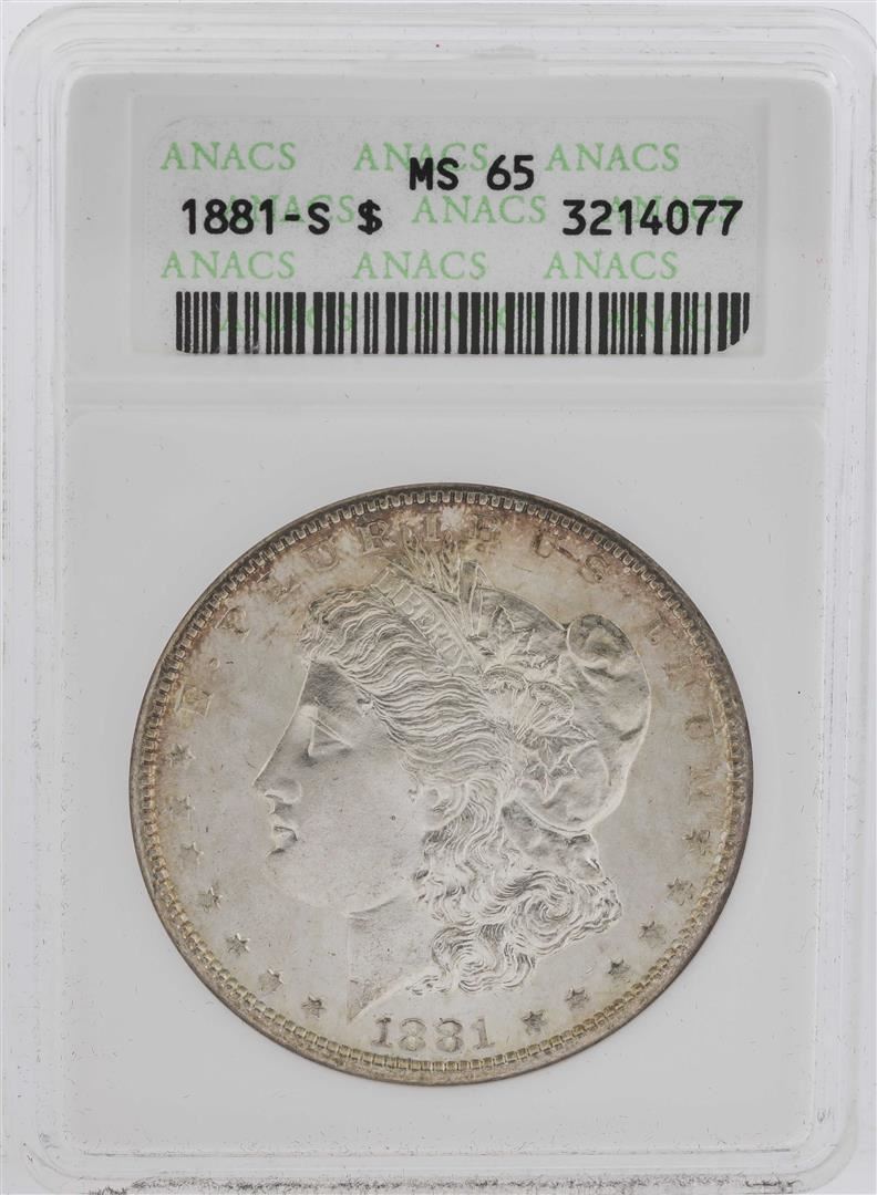 One 1881-S $1 Morgan Silver Dollar Coin ANACS MS65. ANACS Certified.