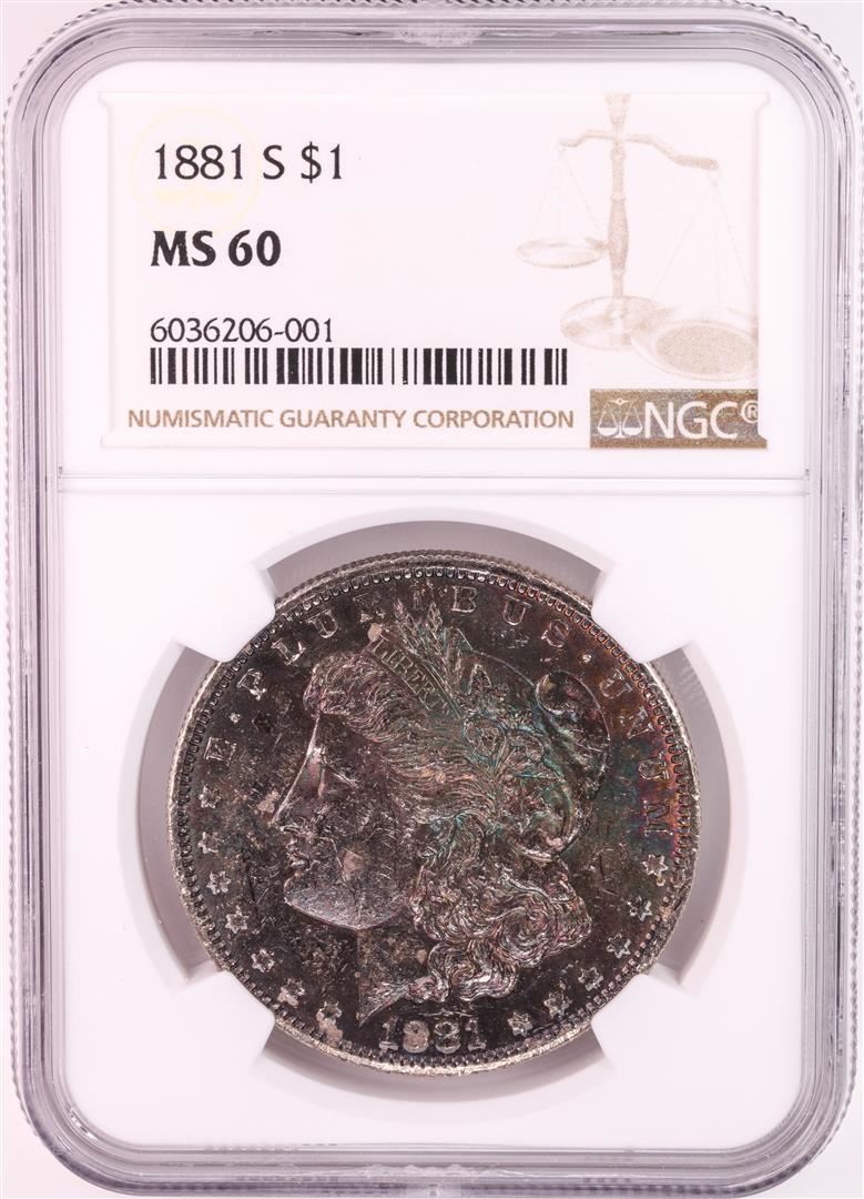 One 1881-S $1 Morgan Silver Dollar Coin NGC MS60 Great Toning. NGC Certified.
