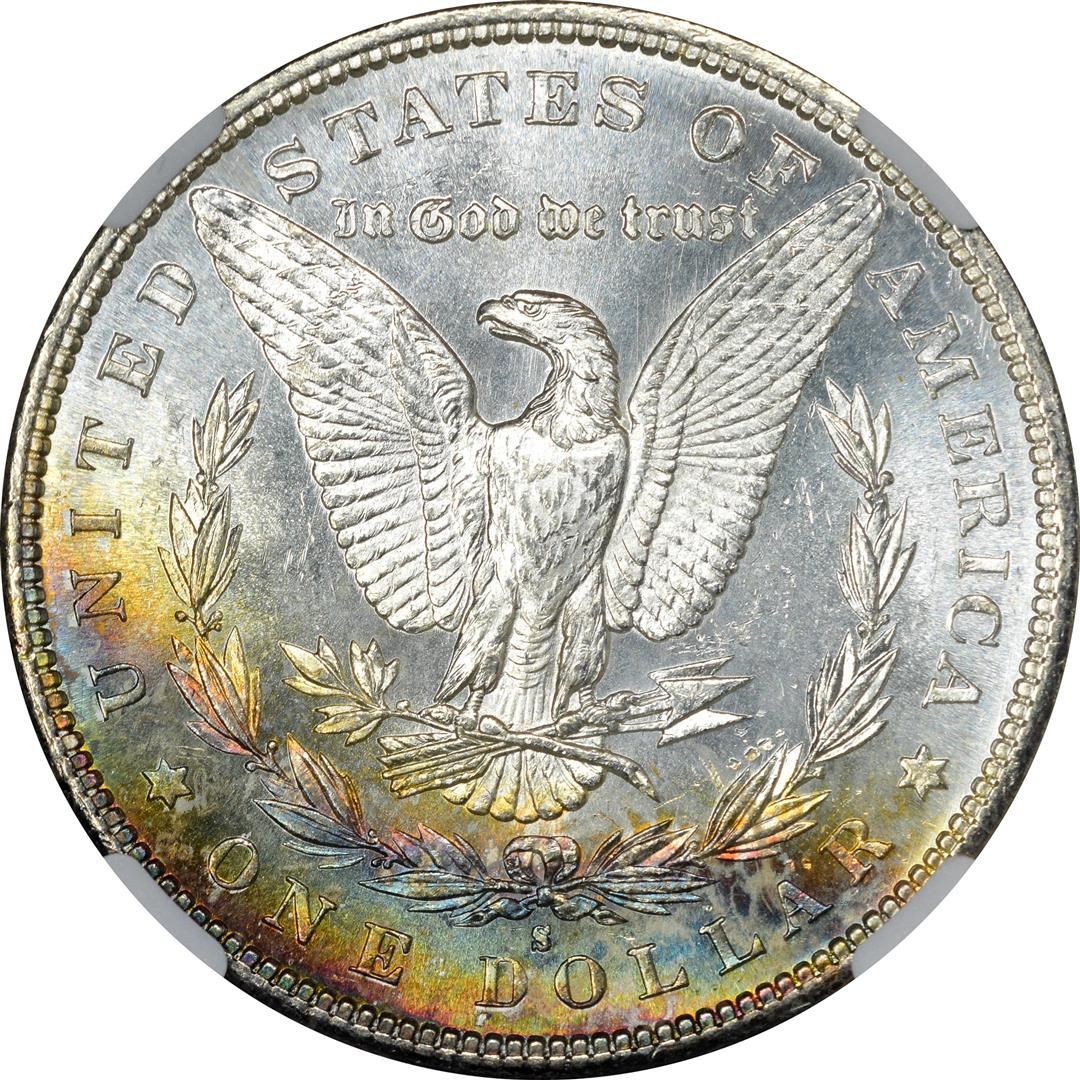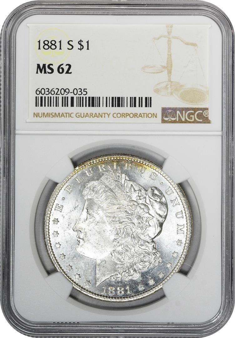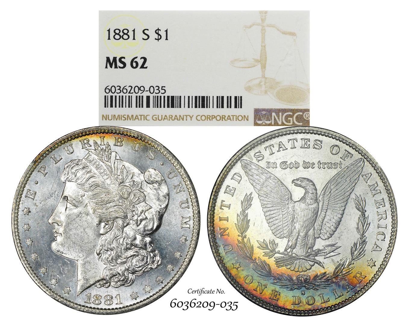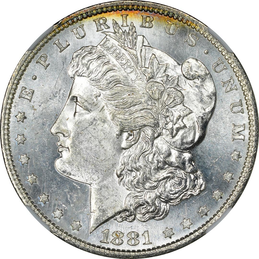 One 1881-S $1 Morgan Silver Dollar Coin NGC MS62 Amazing Toning. NGC Certified.