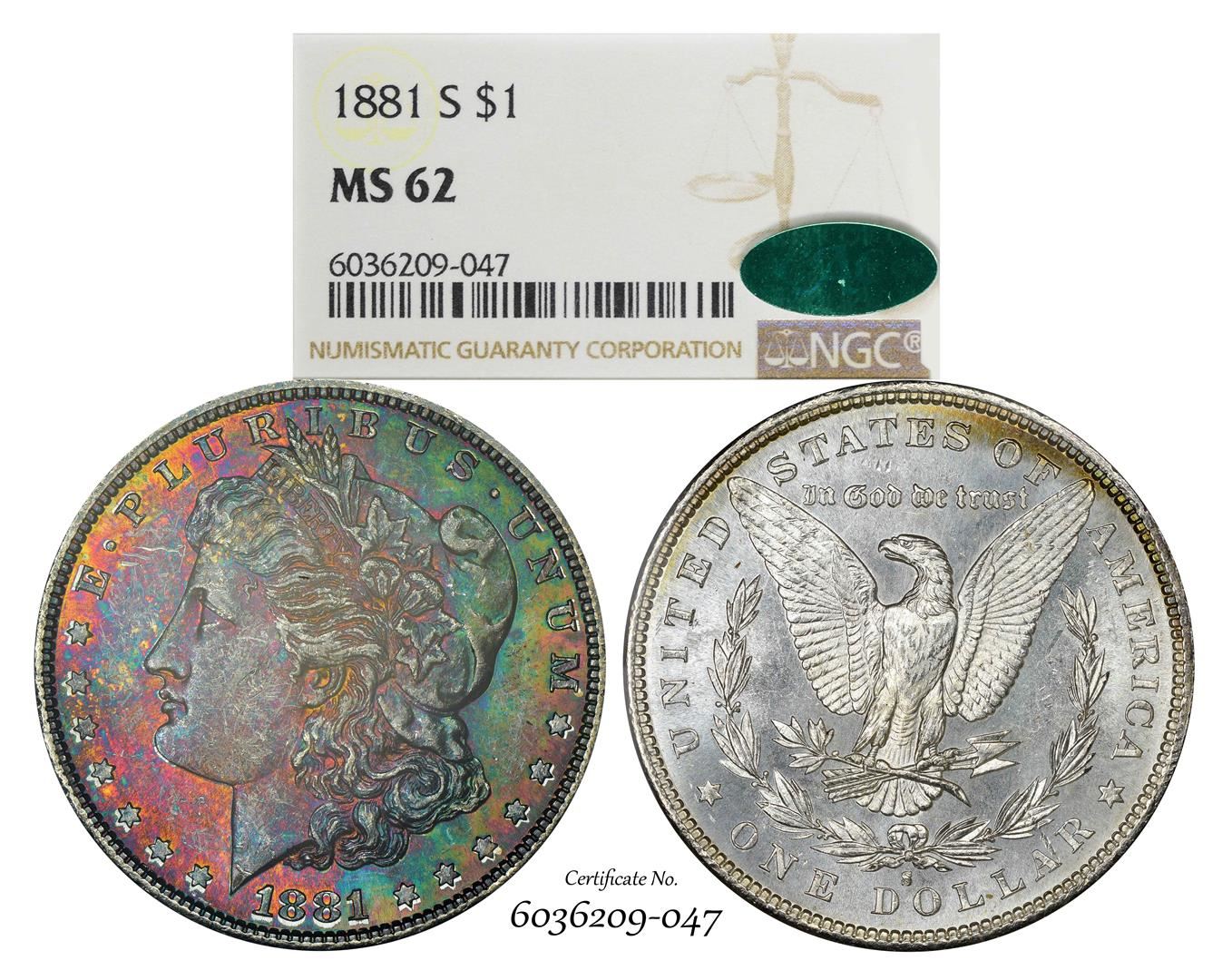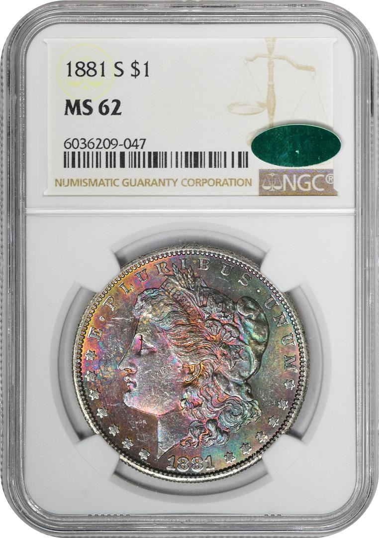 1881-S $1 Morgan Silver Dollar Coin NGC MS62 CAC Amazing Toning