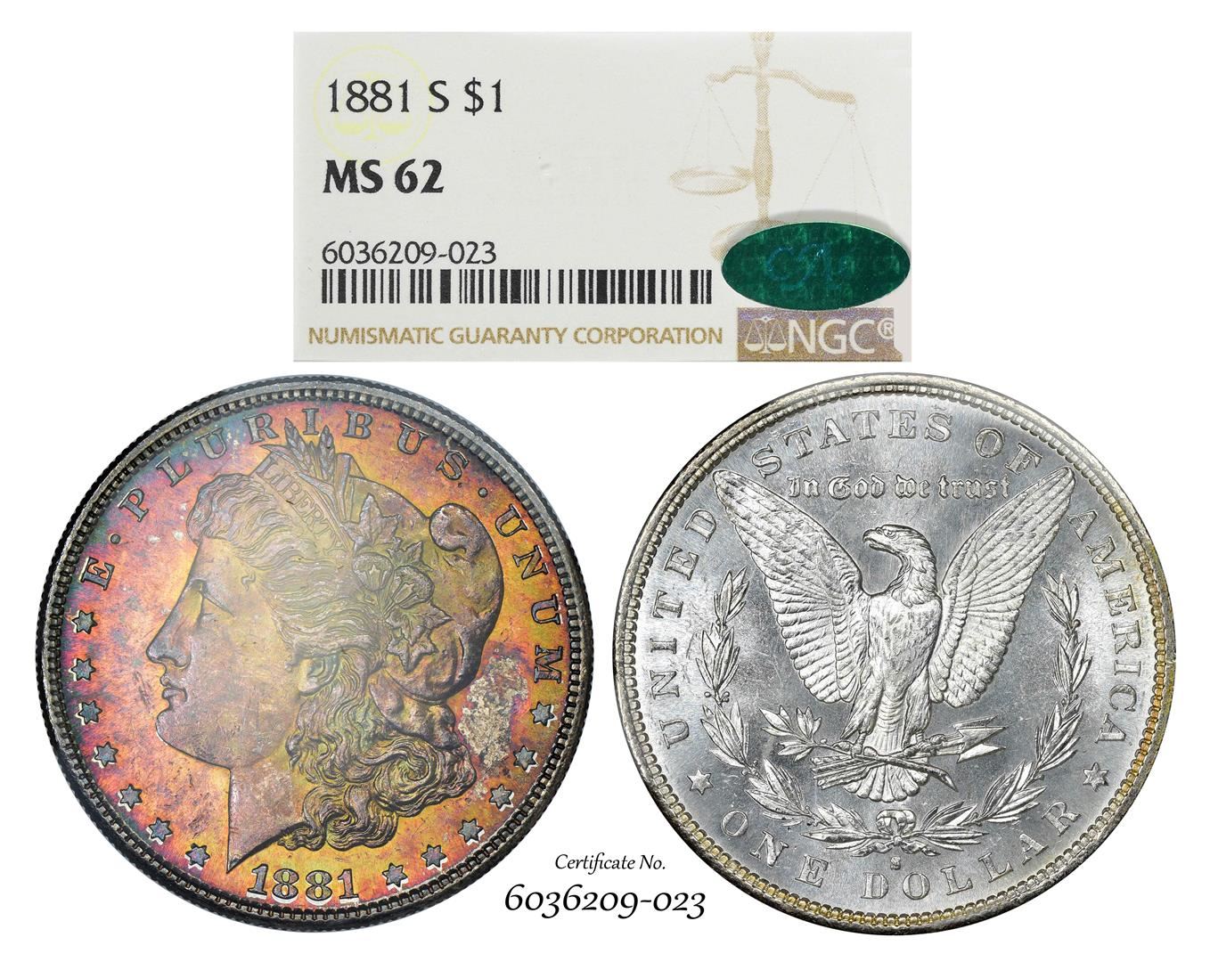 1881-S $1 Morgan Silver Dollar Coin NGC MS62 CAC Amazing Toning