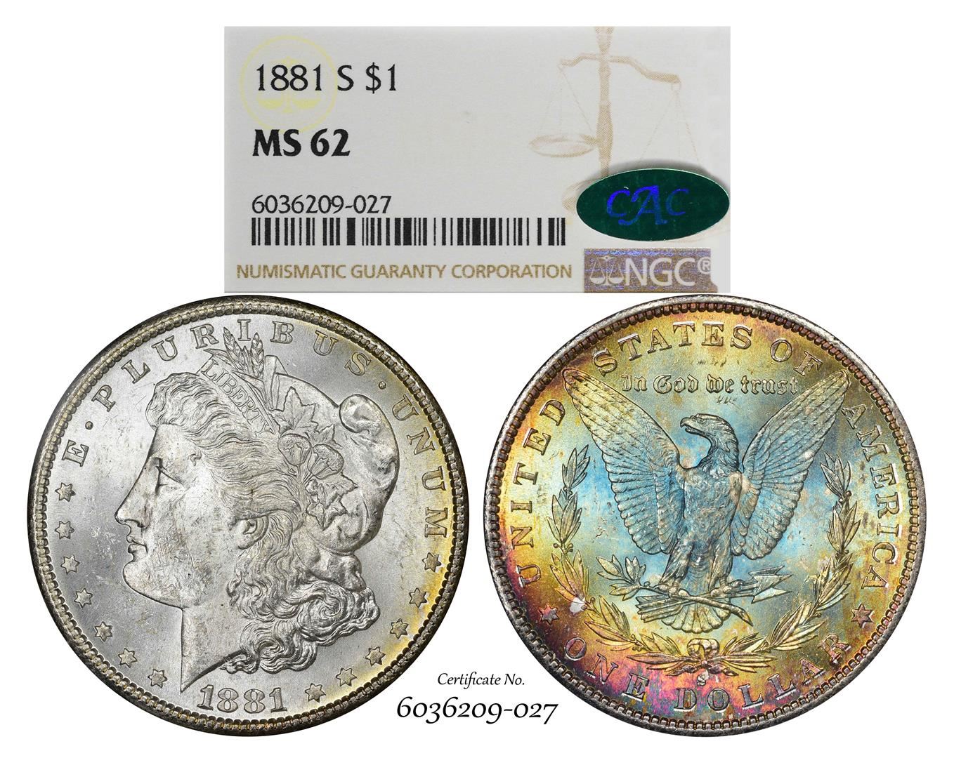 1881-S $1 Morgan Silver Dollar Coin NGC MS62 CAC Amazing Toning