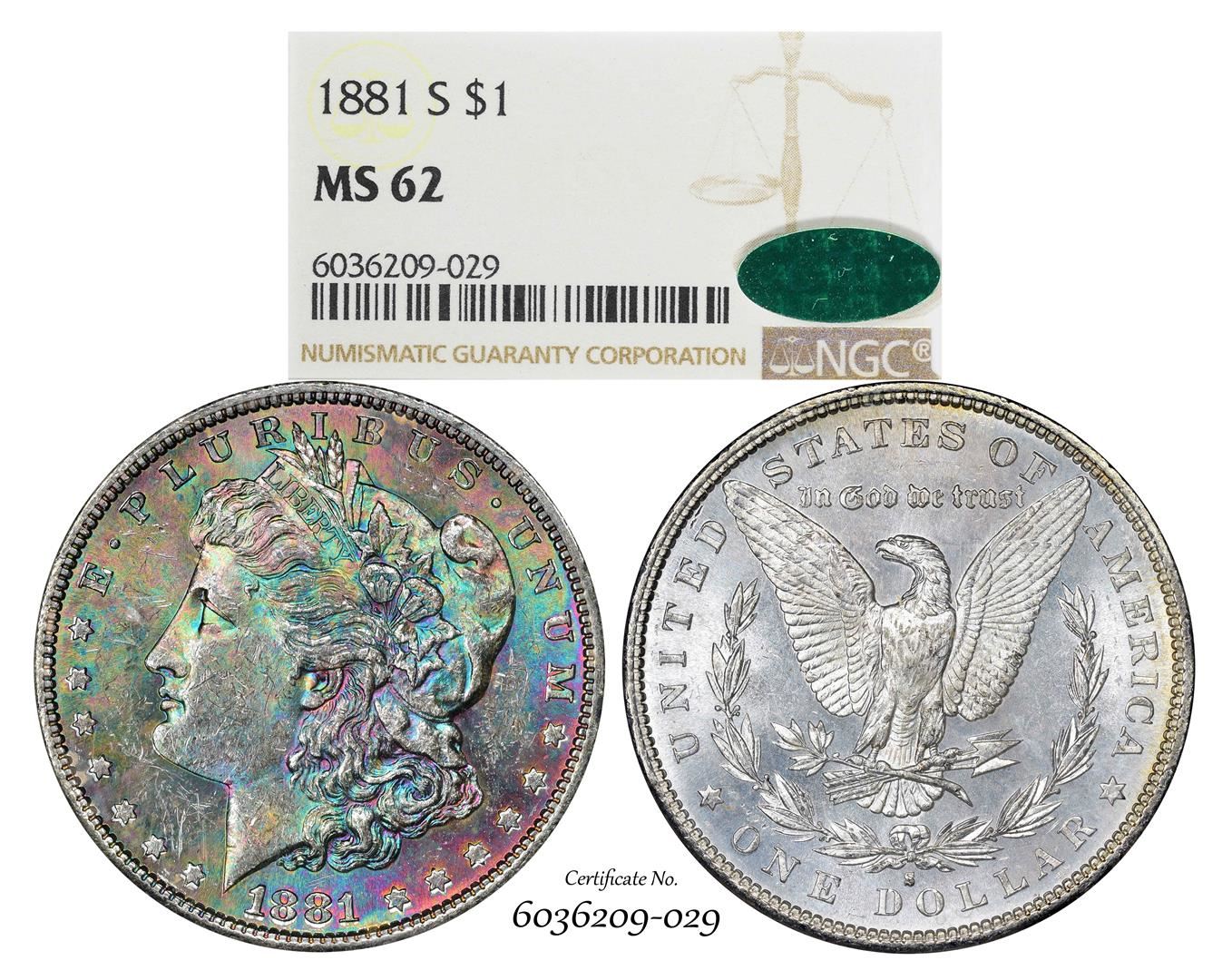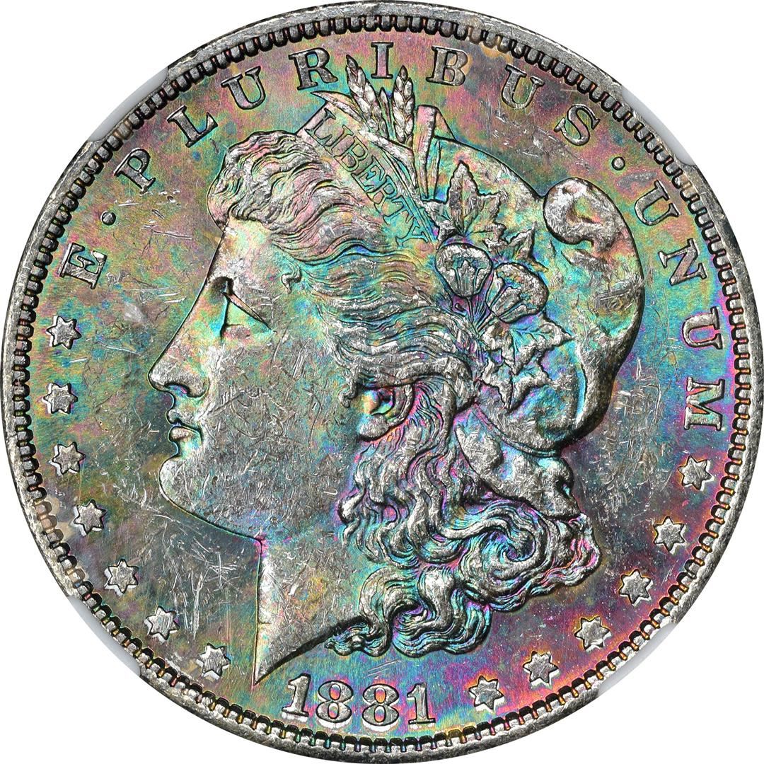 One 1881-S $1 Morgan Silver Dollar Coin NGC MS62 CAC Amazing Toning. NGC Certified.
