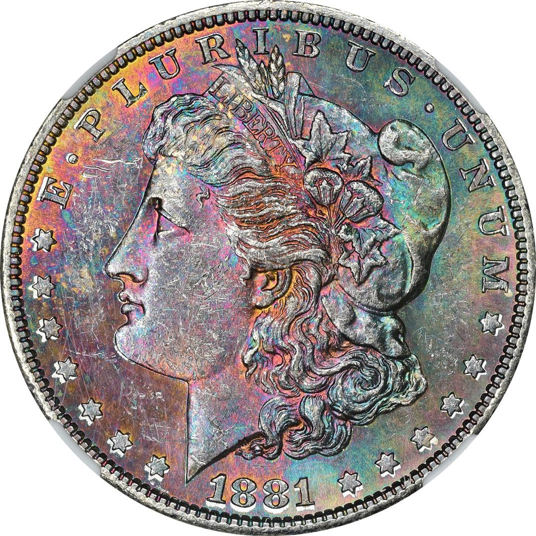 One 1881-S $1 Morgan Silver Dollar Coin NGC MS62 CAC Amazing Toning. NGC Certified.