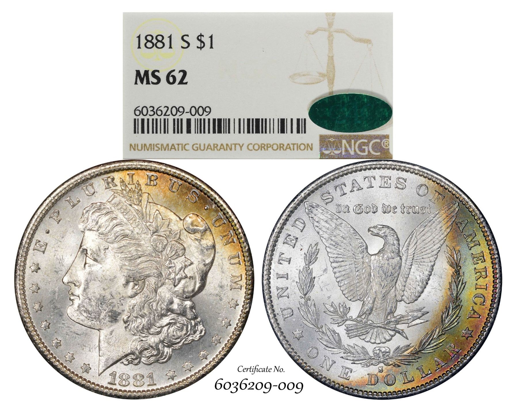 One 1881-S $1 Morgan Silver Dollar Coin NGC MS62 CAC Amazing Toning.