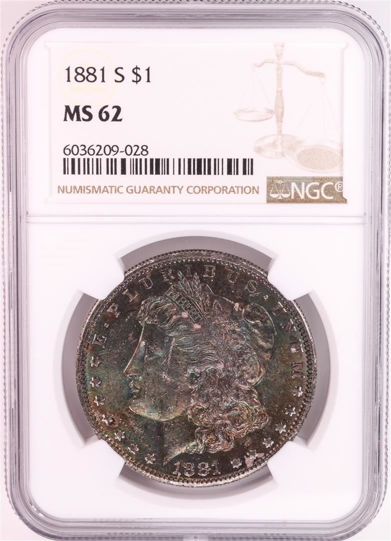 One 1881-S $1 Morgan Silver Dollar Coin NGC MS62 Great Toning. NGC Certified.