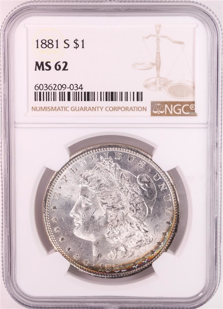One 1881-S $1 Morgan Silver Dollar Coin NGC MS62 Nice Toning. NGC Certified.