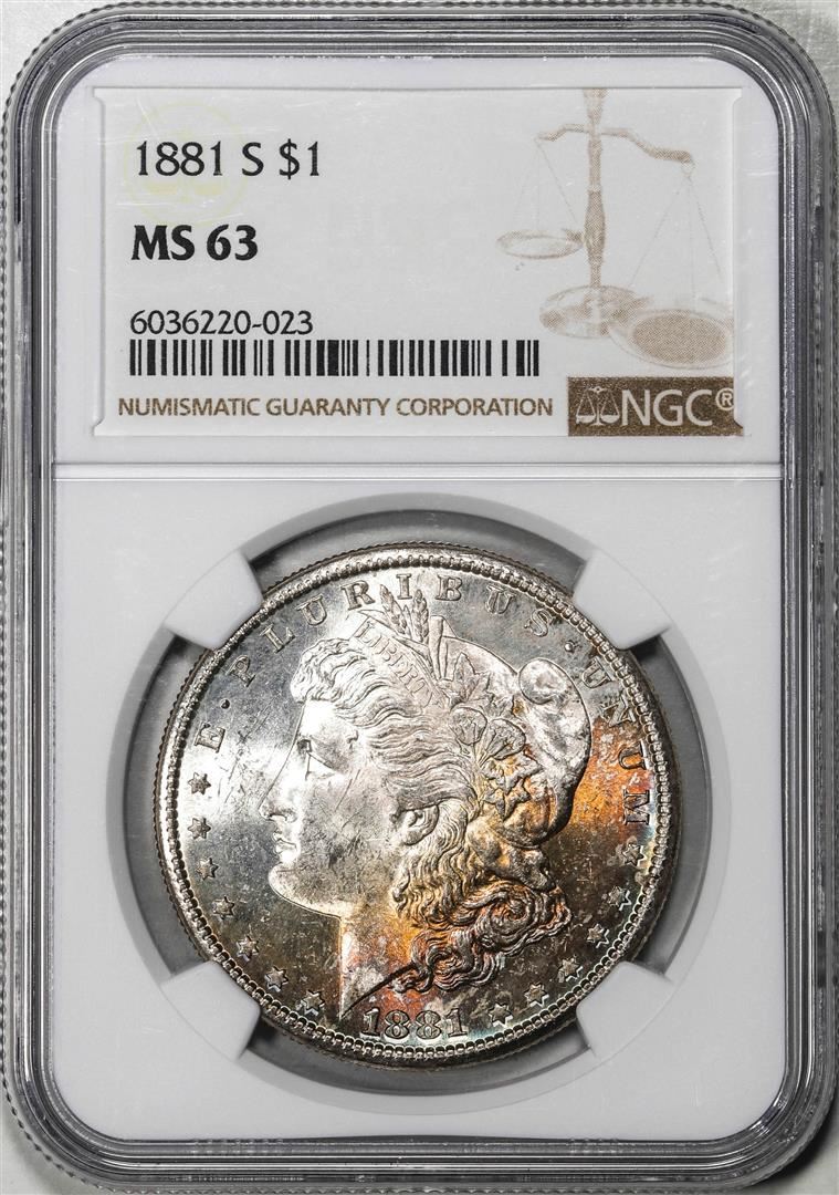One 1881-S $1 Morgan Silver Dollar Coin NGC MS63 Amazing Toning. NGC Certified.