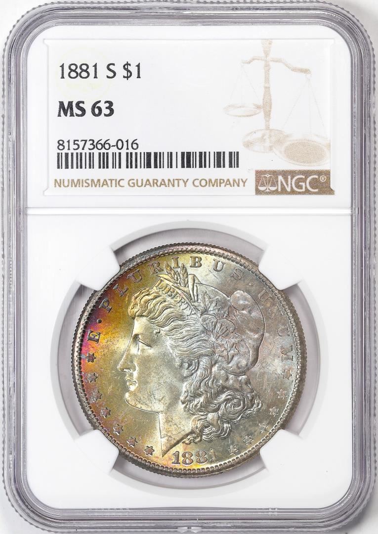 One 1881-S $1 Morgan Silver Dollar Coin NGC MS63 Amazing Toning. NGC Certified.