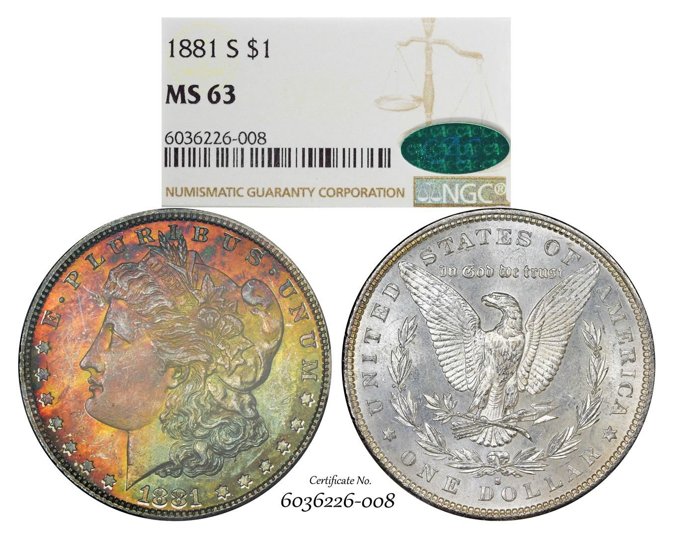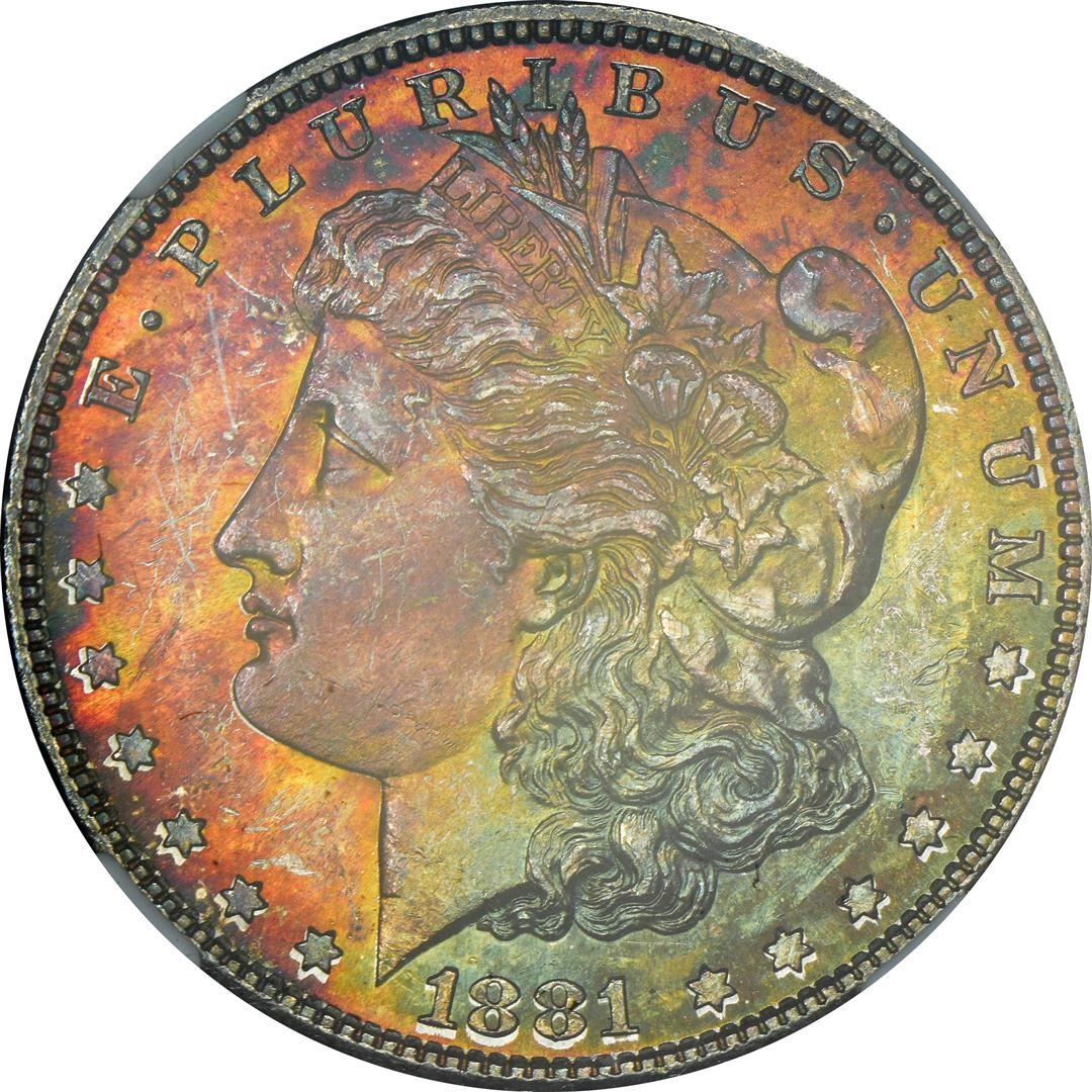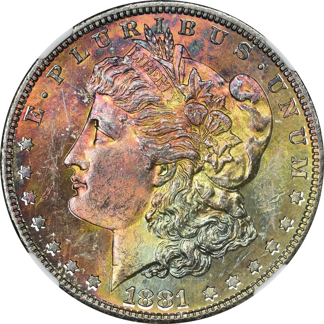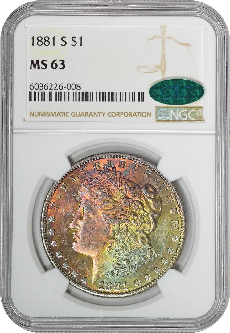 One 1881-S $1 Morgan Silver Dollar Coin NGC MS63 CAC Amazing Toning. NGC Certified.