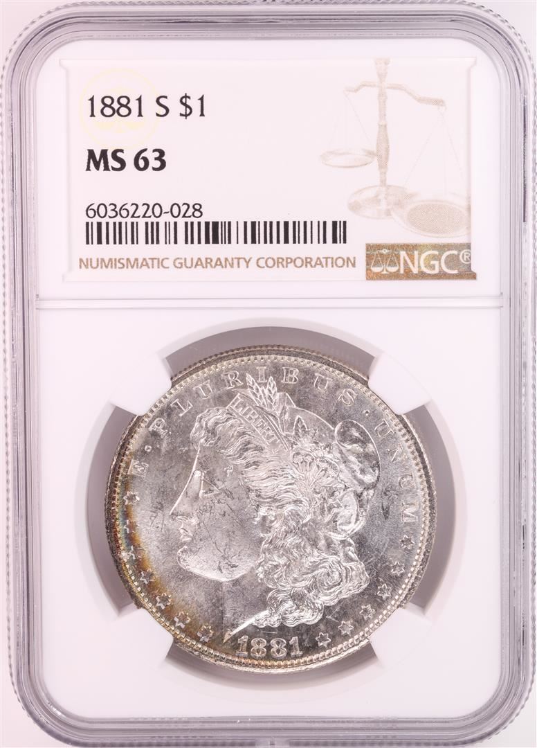 One 1881-S $1 Morgan Silver Dollar Coin NGC MS63 Great Toning. NGC Certified.