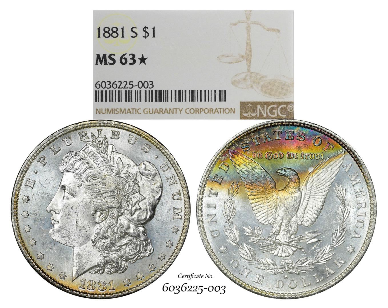 1881-S $1 Morgan Silver Dollar Coin NGC MS63* Star Amazing Toning