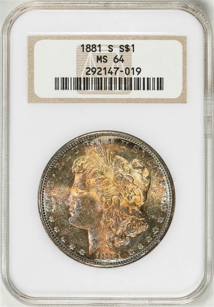 One 1881-S $1 Morgan Silver Dollar Coin NGC MS64 Amazing Toning. NGC Certified.