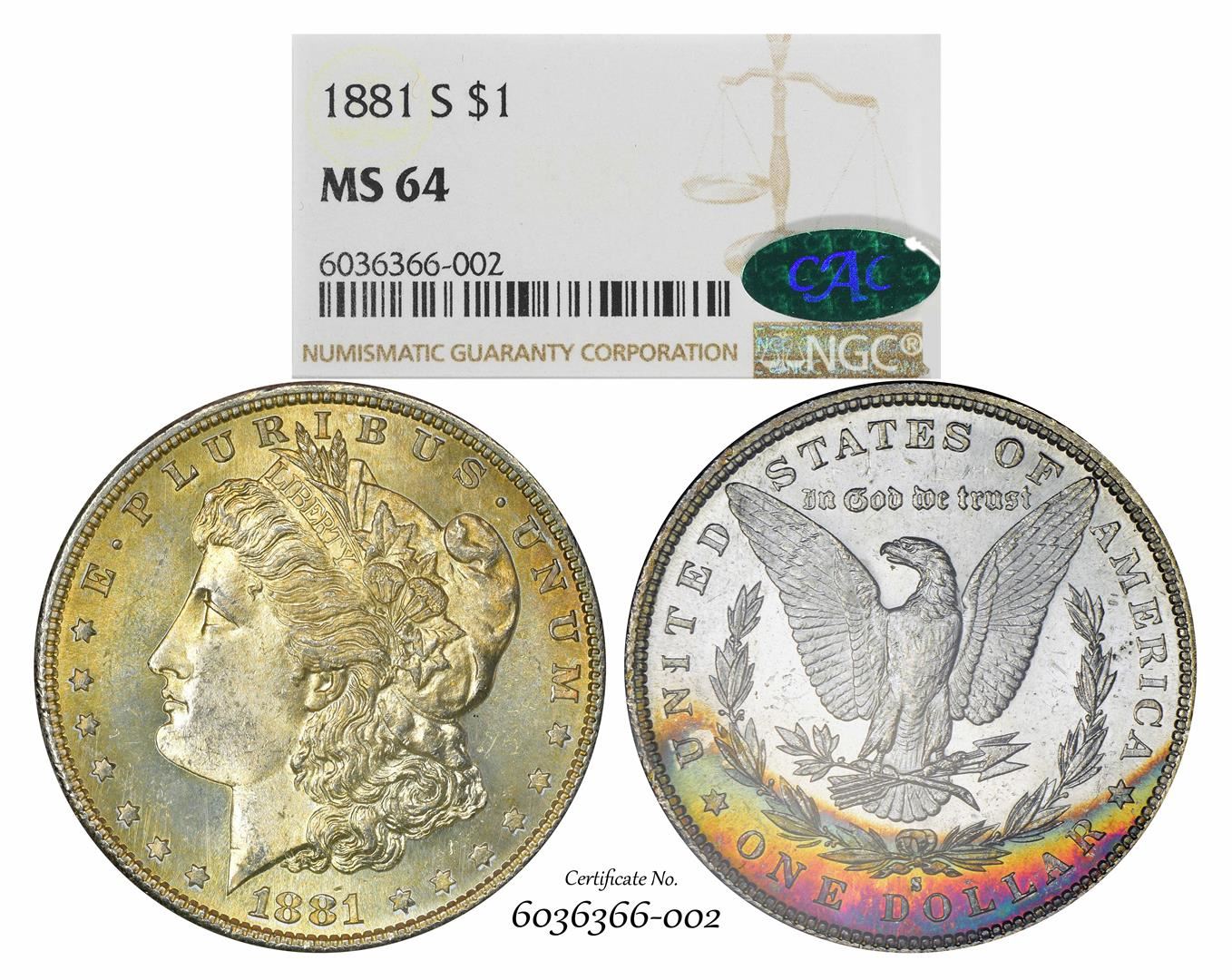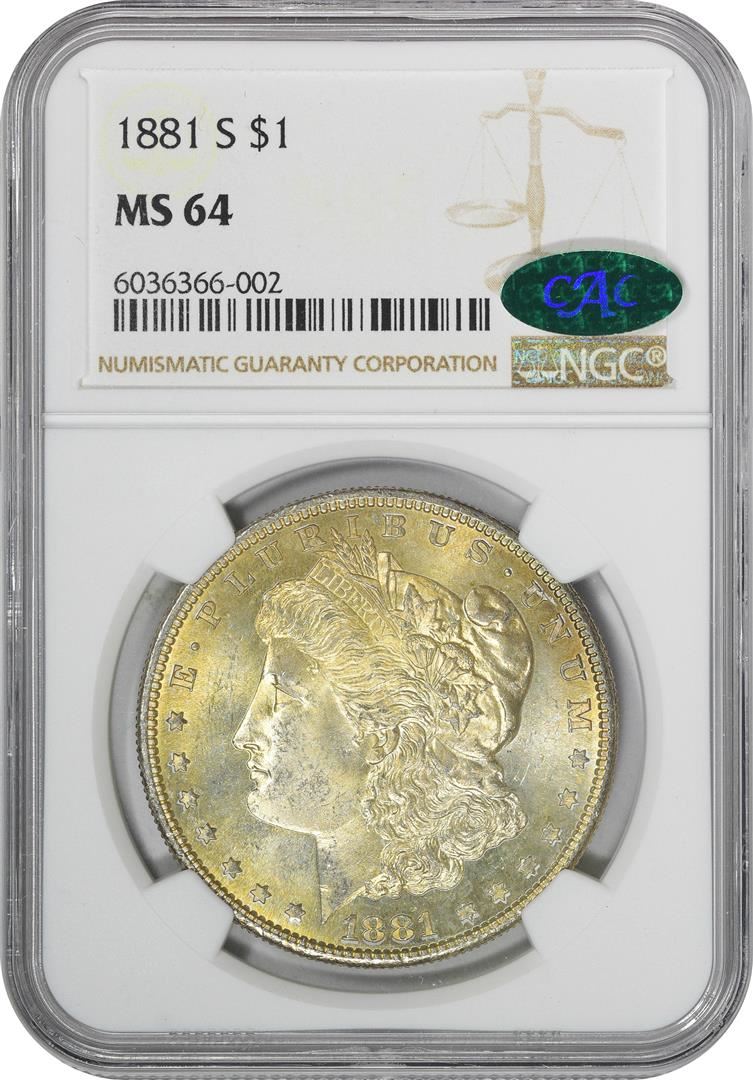 1881-S $1 Morgan Silver Dollar Coin NGC MS64 CAC Amazing Toning