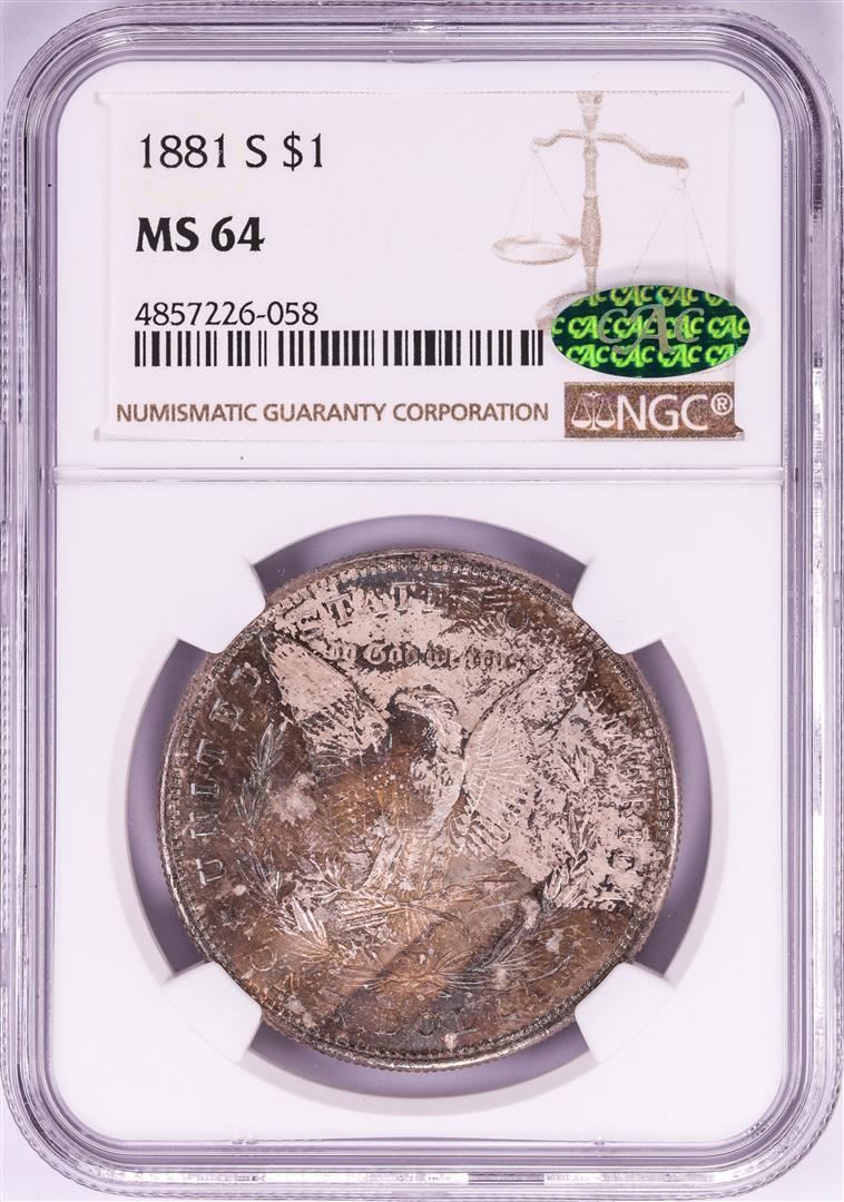 One 1881-S $1 Morgan Silver Dollar Coin NGC MS64 CAC Nice Toning. NGC Certified.