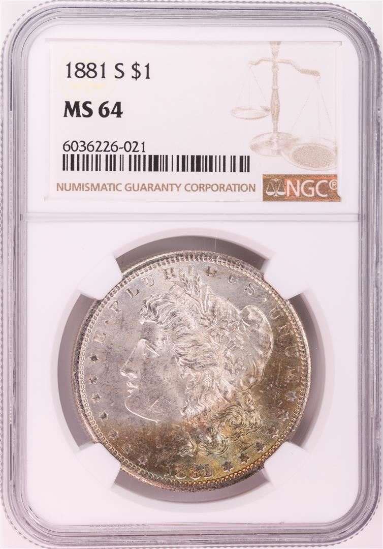 One 1881-S $1 Morgan Silver Dollar Coin NGC MS64 Great Toning. NGC Certified.
