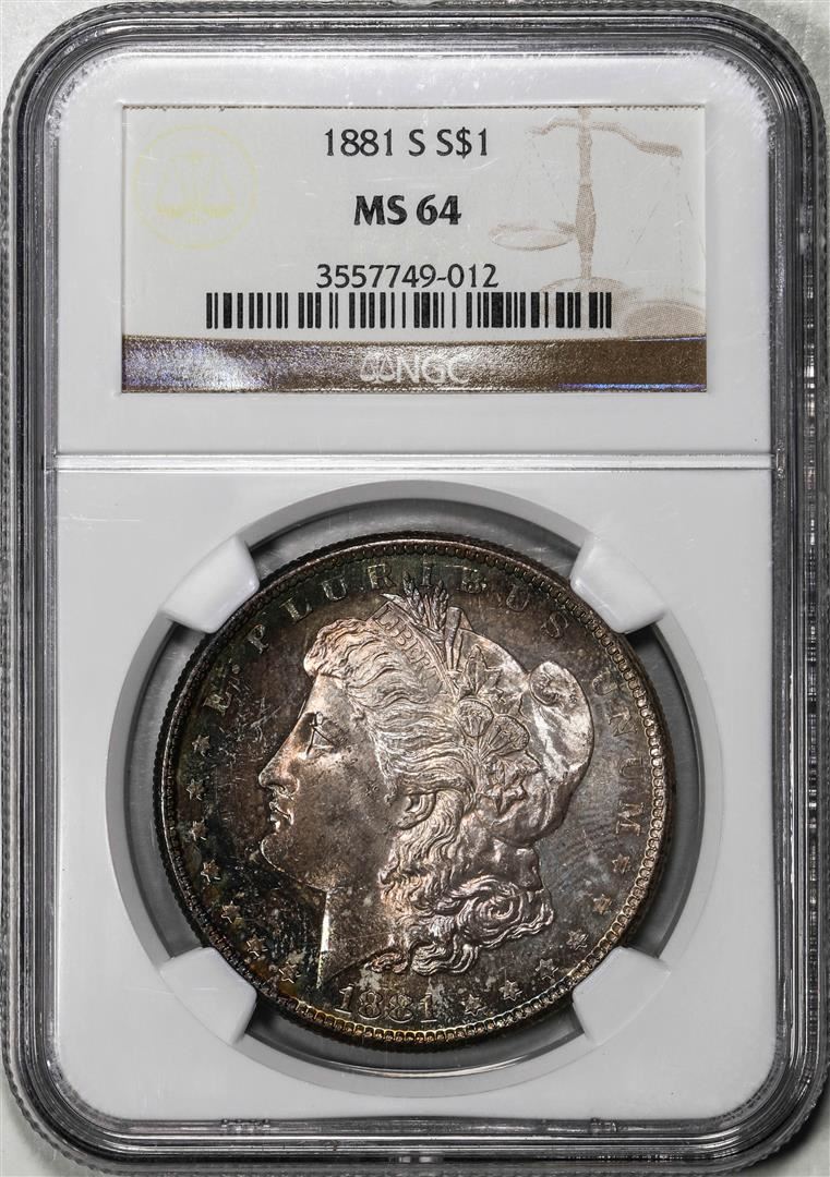 One 1881-S $1 Morgan Silver Dollar Coin NGC MS64 Nice Toning. NGC Certified.