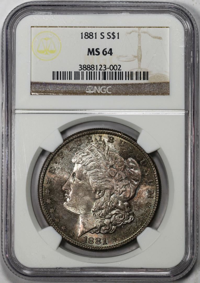 One 1881-S $1 Morgan Silver Dollar Coin NGC MS64 Nice Toning. NGC Certified.