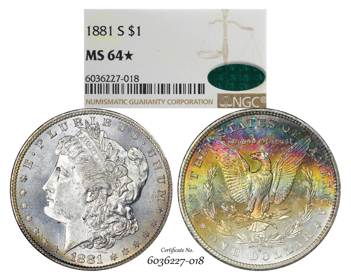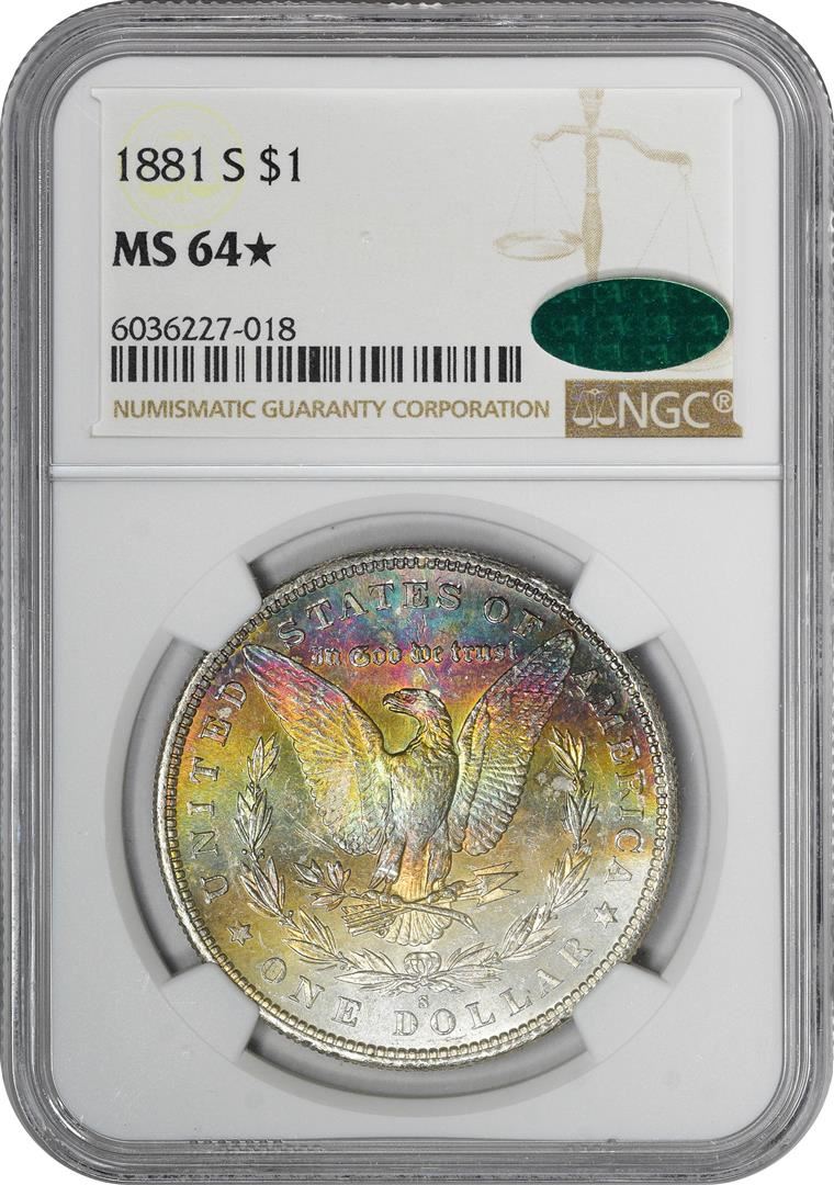1881-S $1 Morgan Silver Dollar Coin NGC MS64* Star CAC Amazing Toning