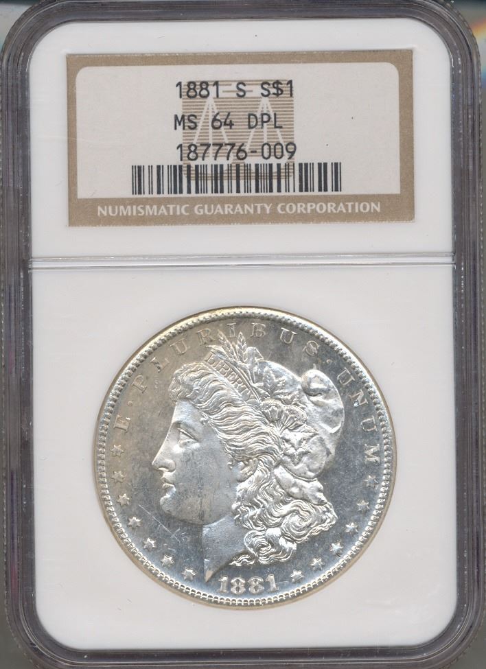 One 1881-S $1 Morgan Silver Dollar Coin NGC MS64DPL.