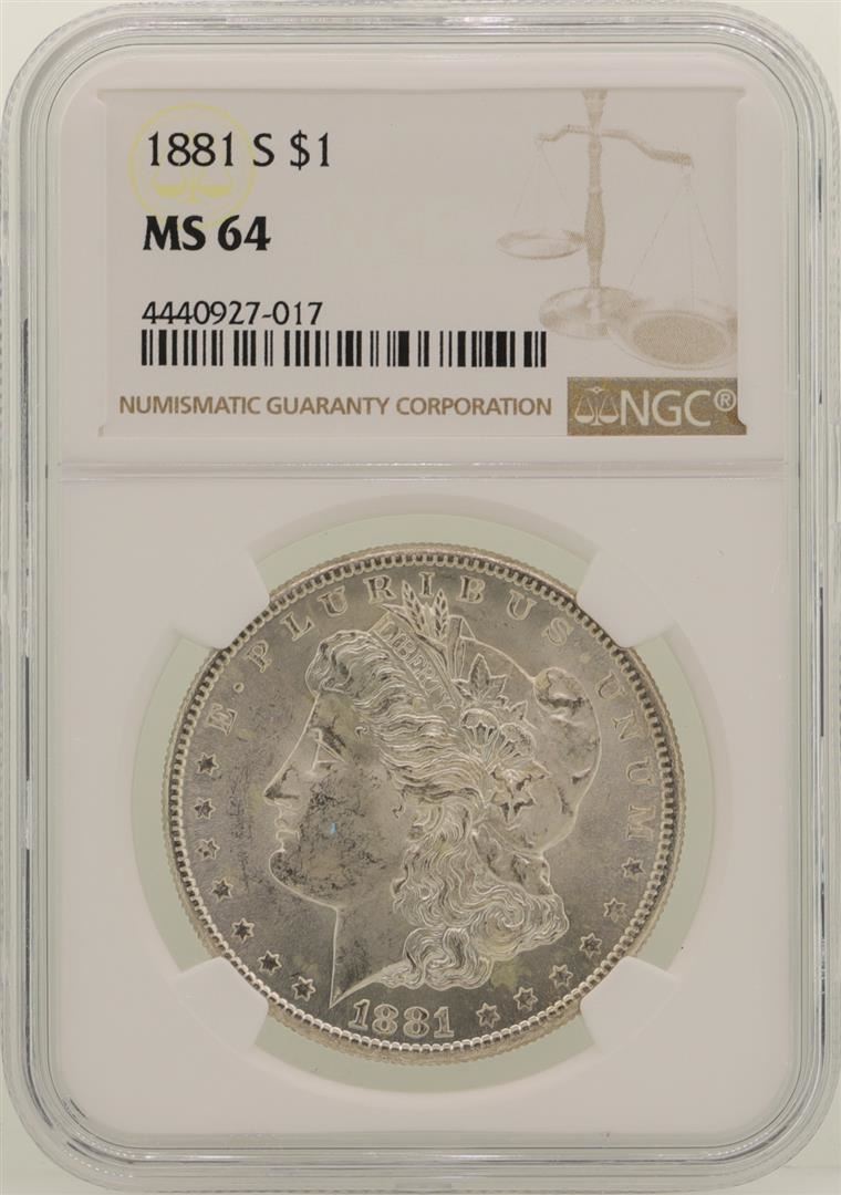 One 1881-S $1 Morgan Silver Dollar Coin NGC MS64. NGC Certified.