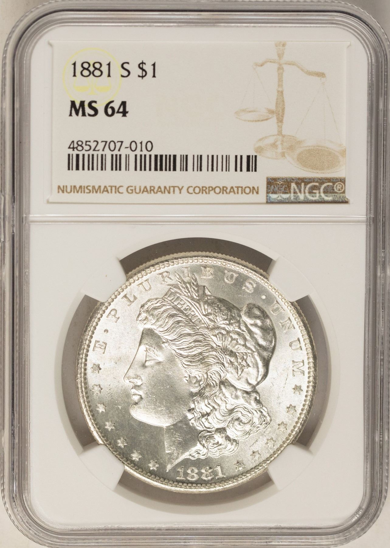 One 1881-S $1 Morgan Silver Dollar Coin NGC MS64.