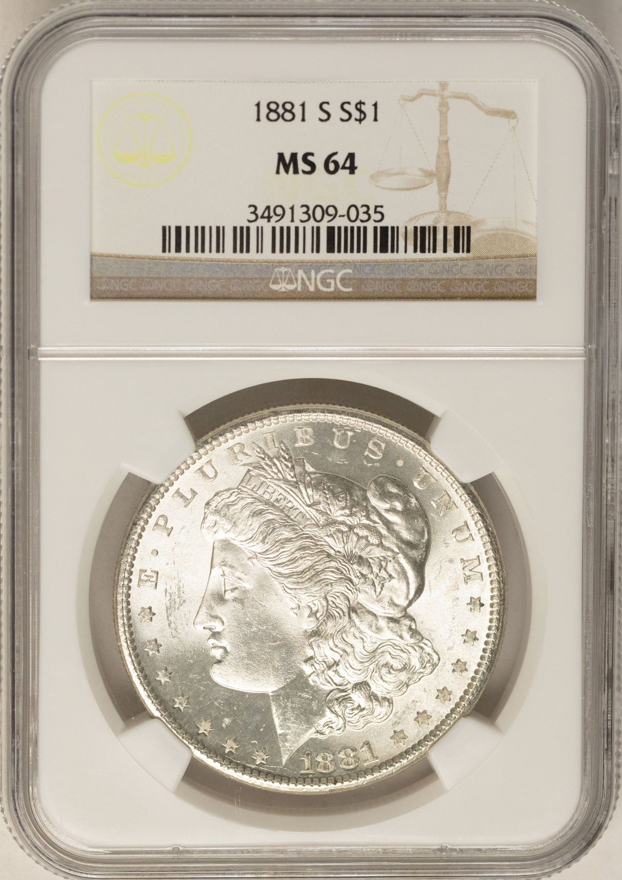 One 1881-S $1 Morgan Silver Dollar Coin NGC MS64.