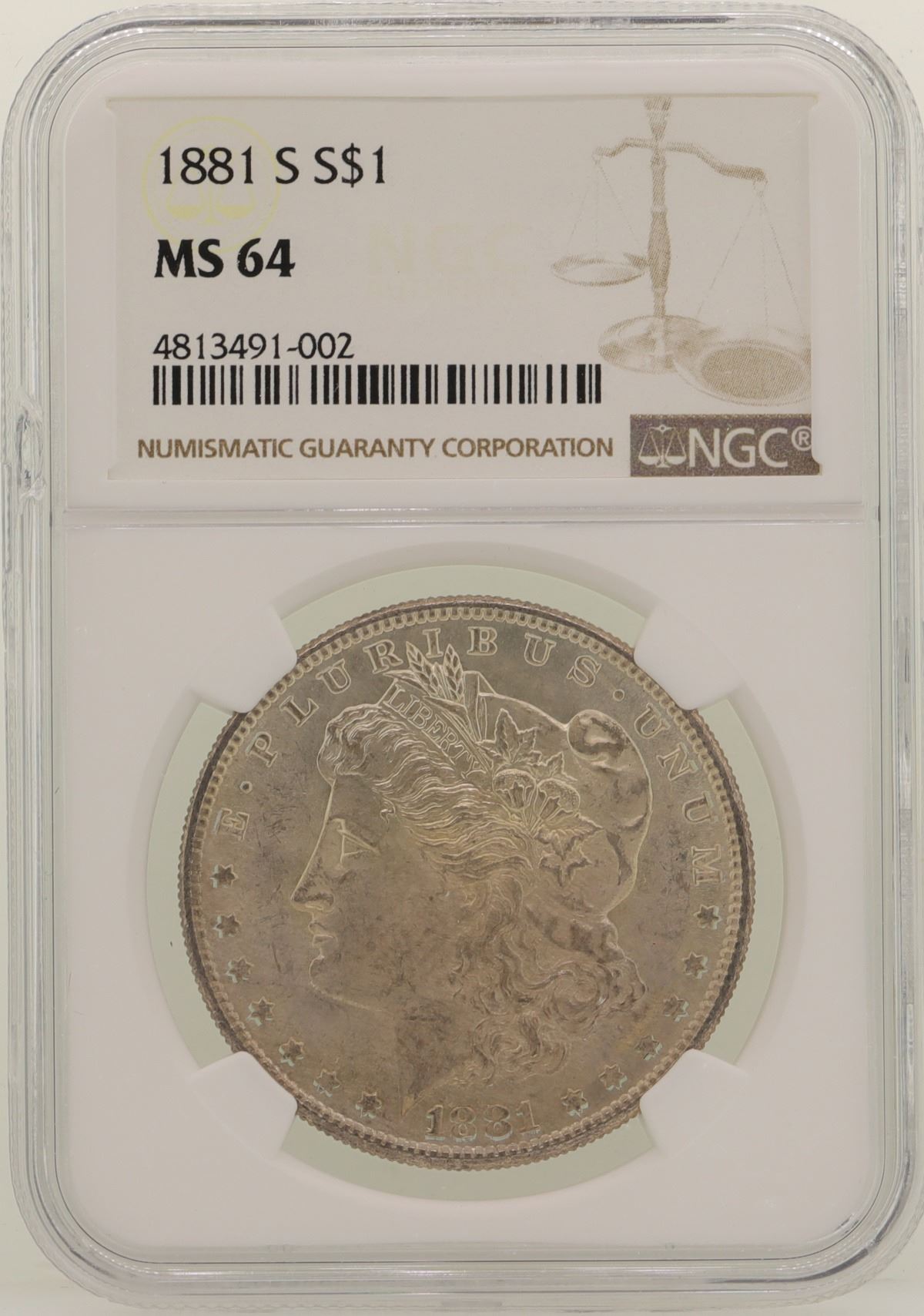 One 1881-S $1 Morgan Silver Dollar Coin NGC MS64.