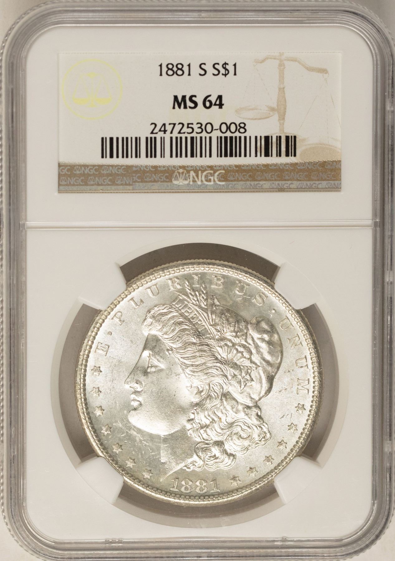 One 1881-S $1 Morgan Silver Dollar Coin NGC MS64.