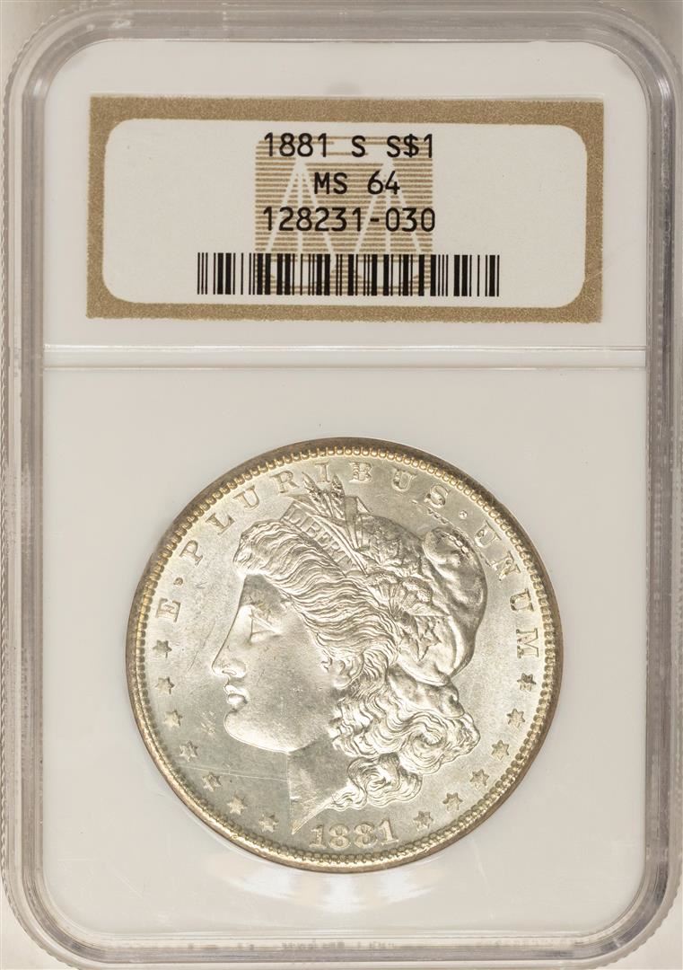 One 1881-S $1 Morgan Silver Dollar Coin NGC MS64. NGC Certified.