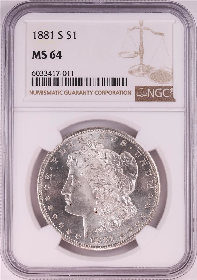 One 1881-S $1 Morgan Silver Dollar Coin NGC MS64.