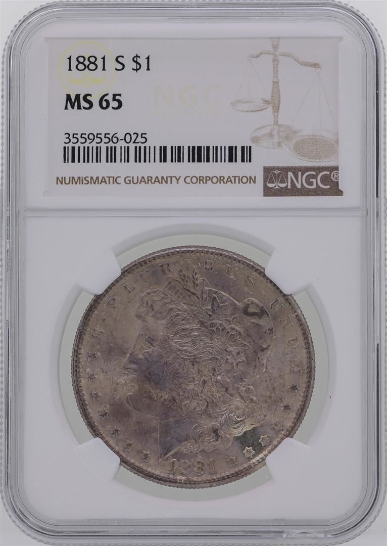 One 1881-S $1 Morgan Silver Dollar Coin NGC MS65 Amazing Toning. NGC Certified.