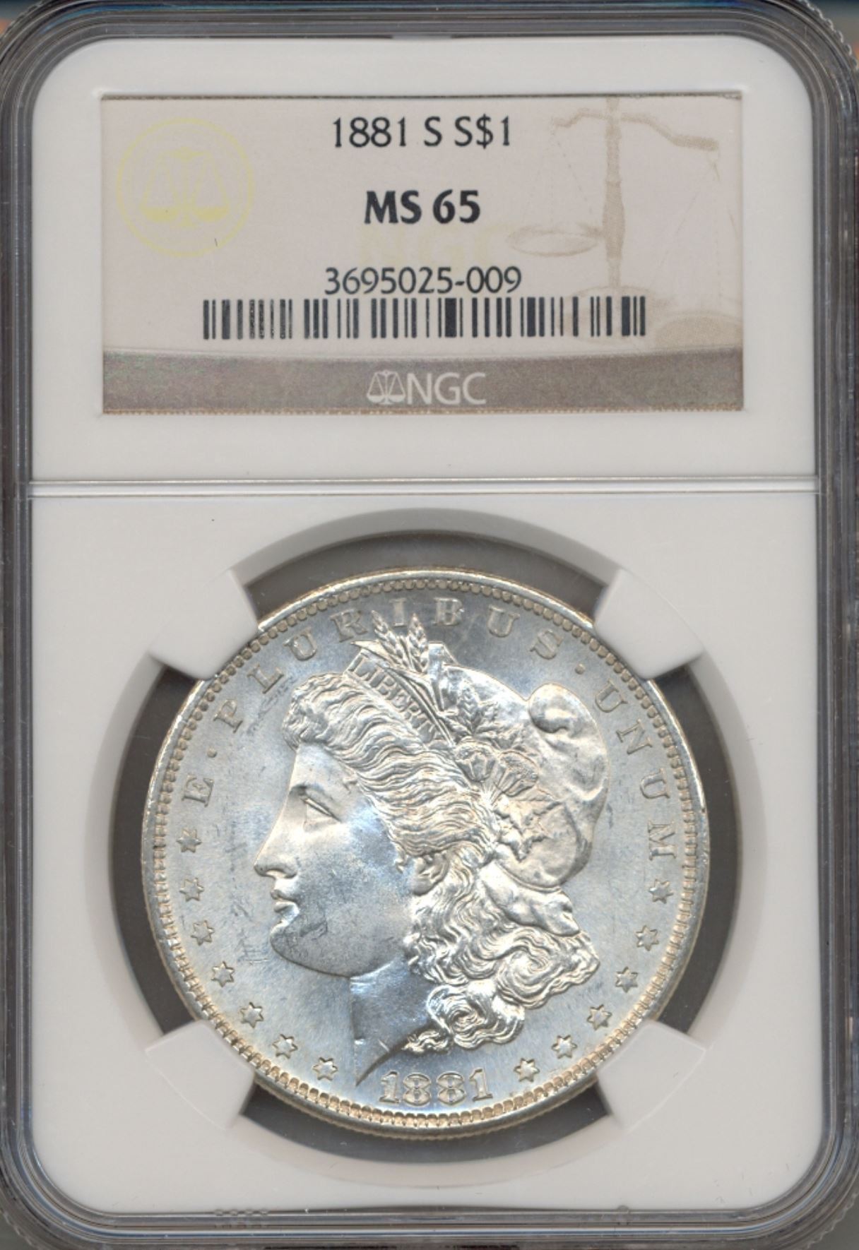 One 1881-S $1 Morgan Silver Dollar Coin NGC MS65.