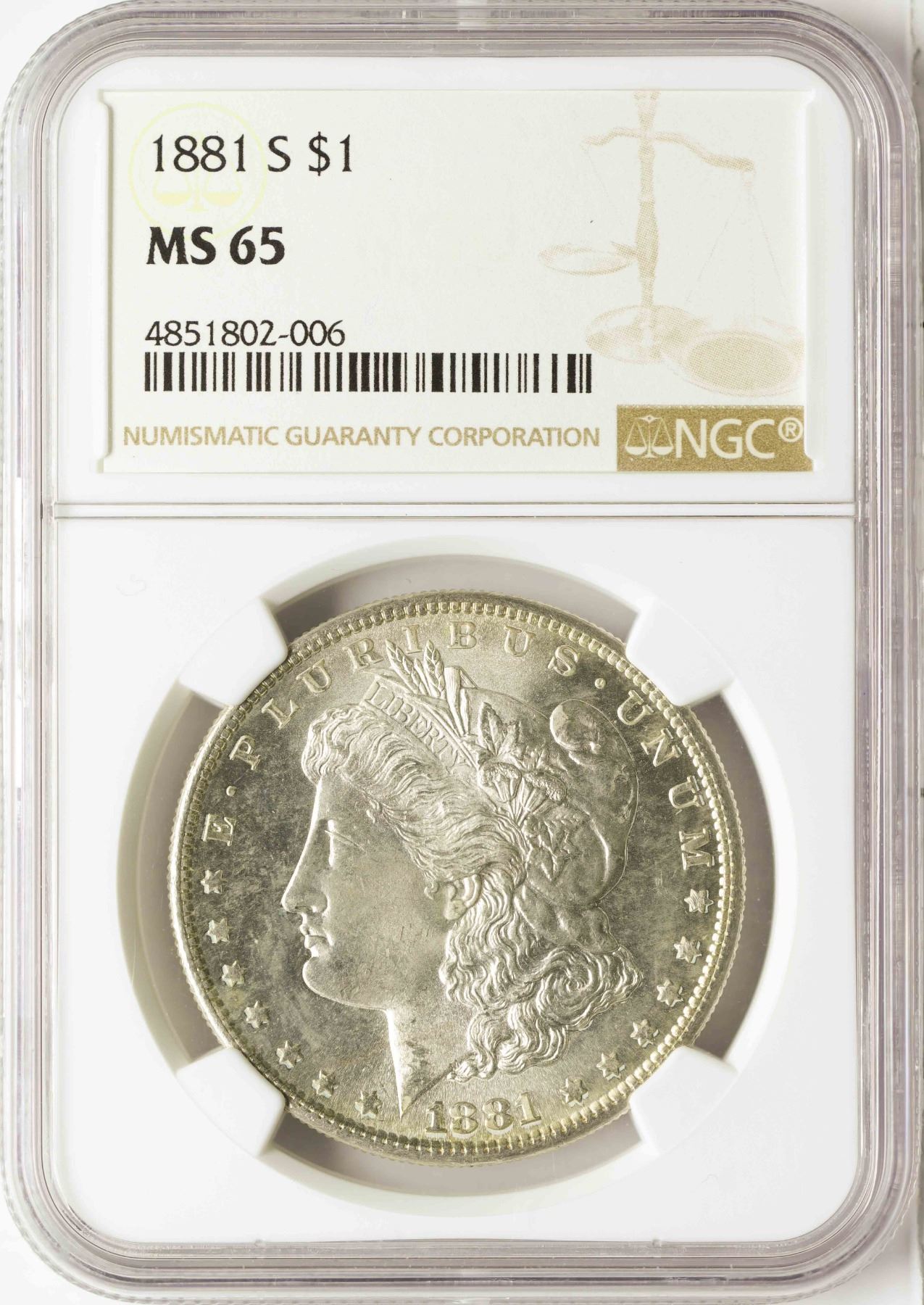 One 1881-S $1 Morgan Silver Dollar Coin NGC MS65.
