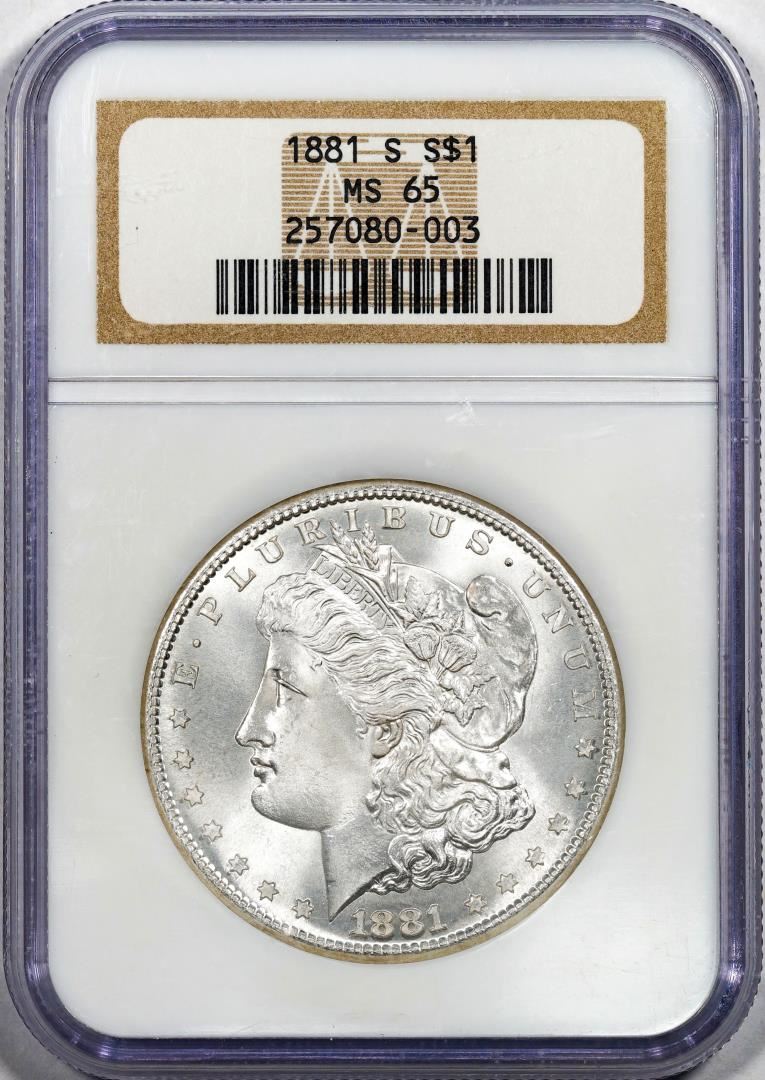 One 1881-S $1 Morgan Silver Dollar Coin NGC MS65.