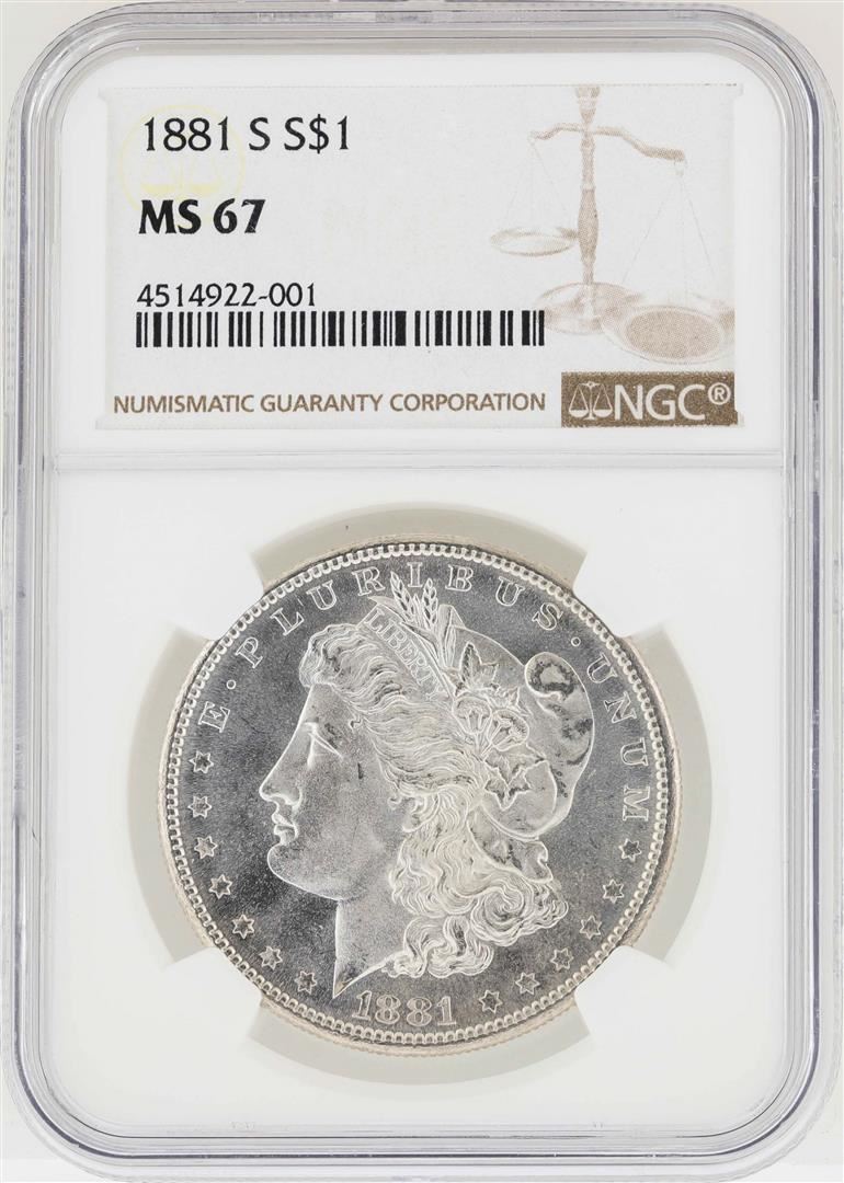One 1881-S $1 Morgan Silver Dollar Coin NGC MS67. NGC Certified.