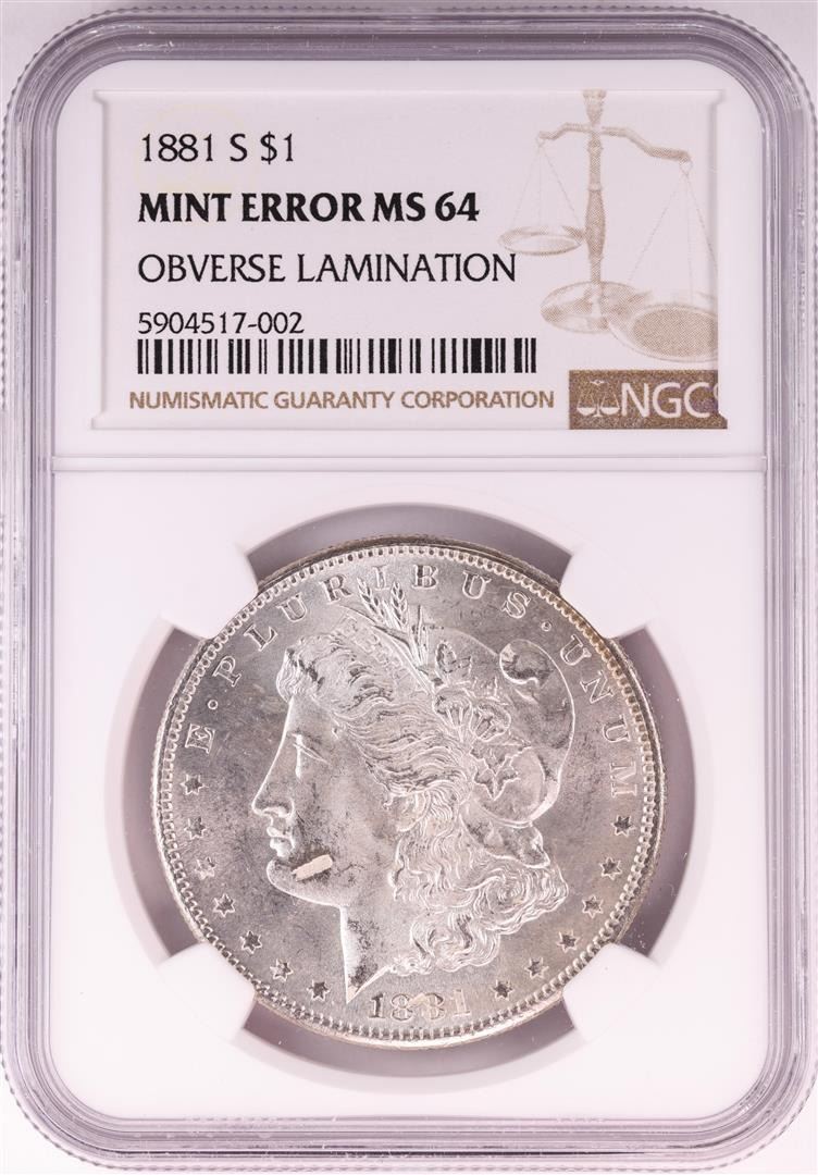 One 1881-S $1 Morgan Silver Dollar Coin NGC Mint Error Obverse Lamination MS62. NGC Certified.