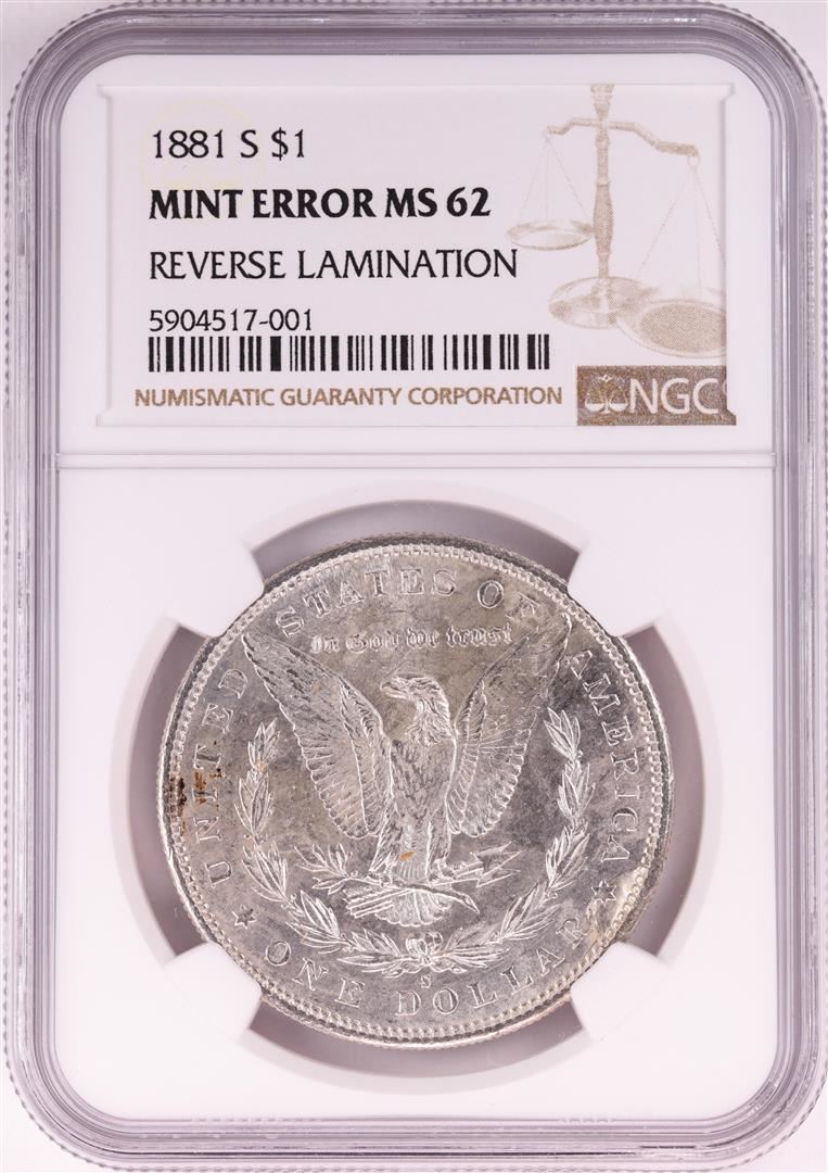 One 1881-S $1 Morgan Silver Dollar Coin NGC Mint Error Reverse Lamination MS62. NGC Certified.