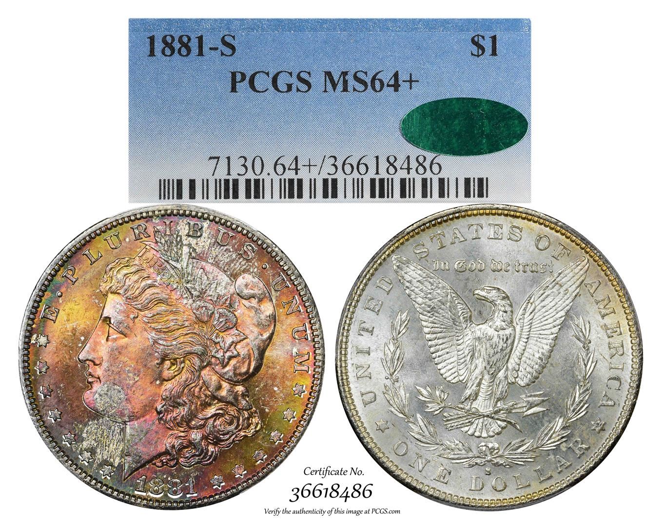 1881-S $1 Morgan Silver Dollar Coin PCGS MS64+ CAC Amazing Toning