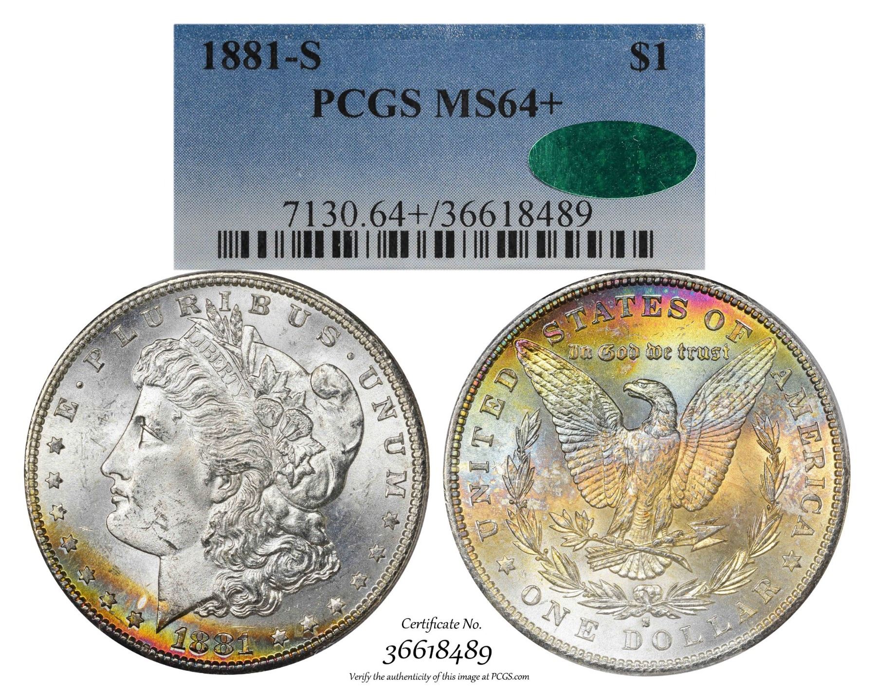 1881-S $1 Morgan Silver Dollar Coin PCGS MS64+ CAC Amazing Toning