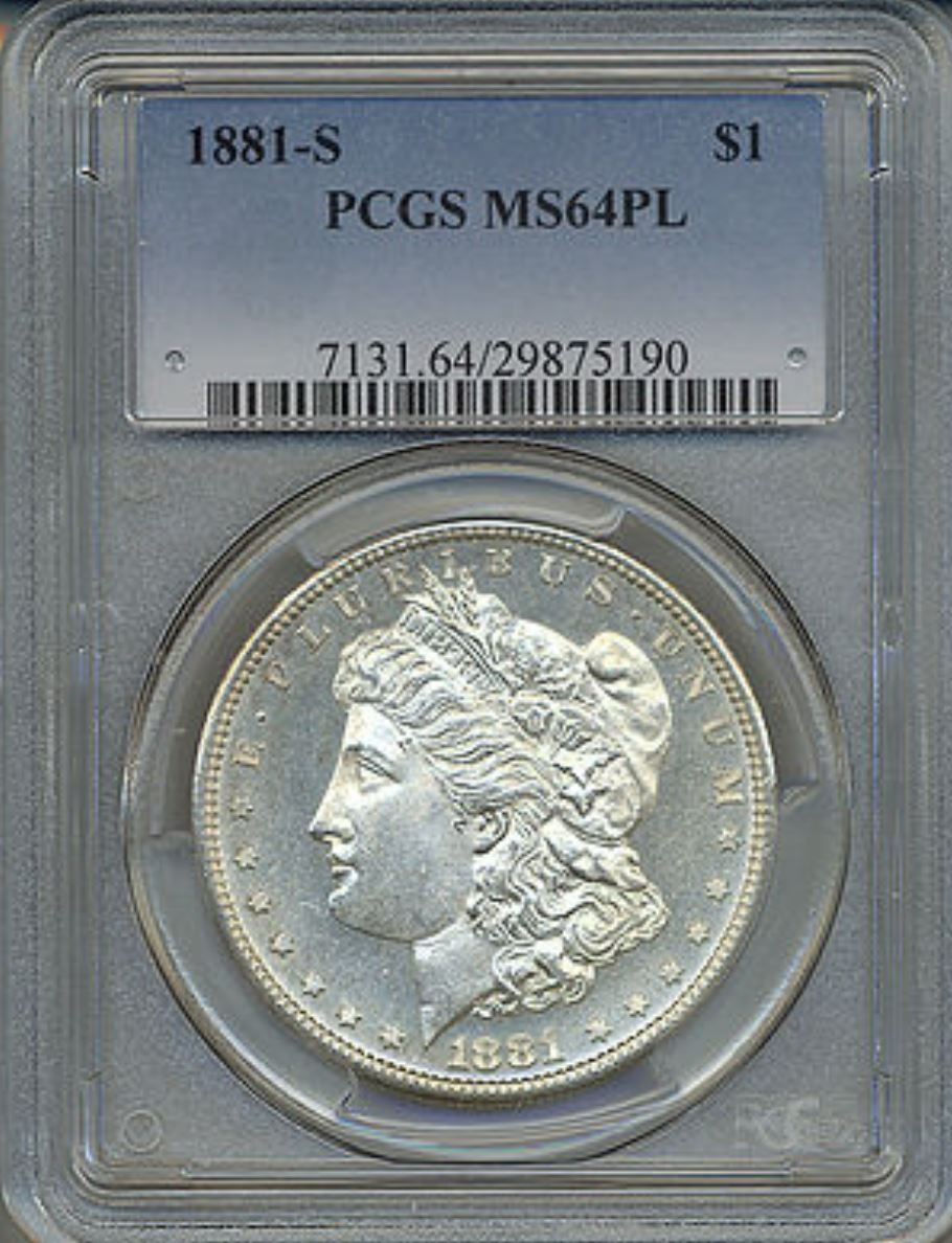 One 1881-S $1 Morgan Silver Dollar Coin PCGS MS64PL.