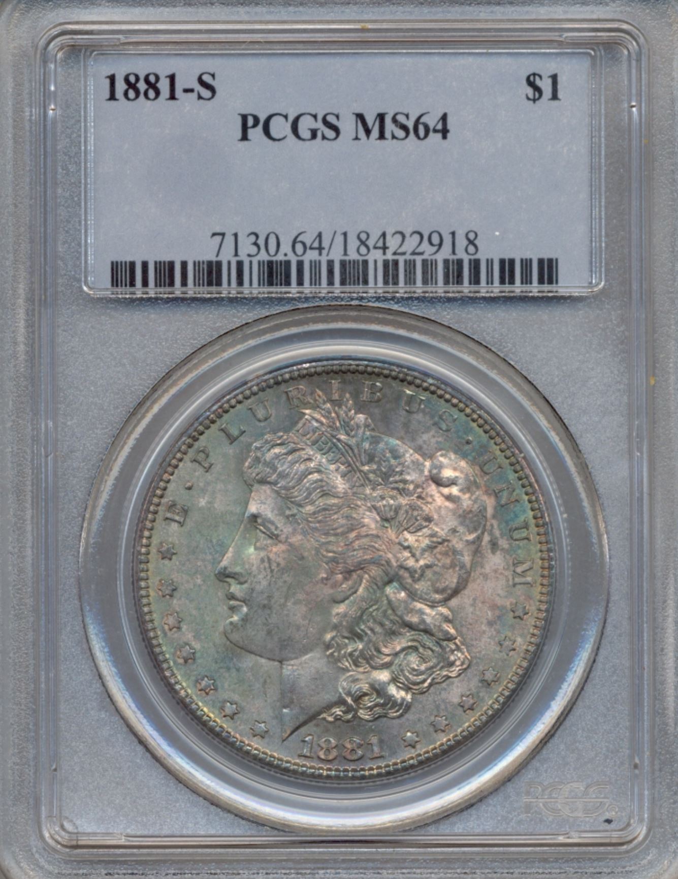 One 1881-S $1 Morgan Silver Dollar Coin PCGS MS64.