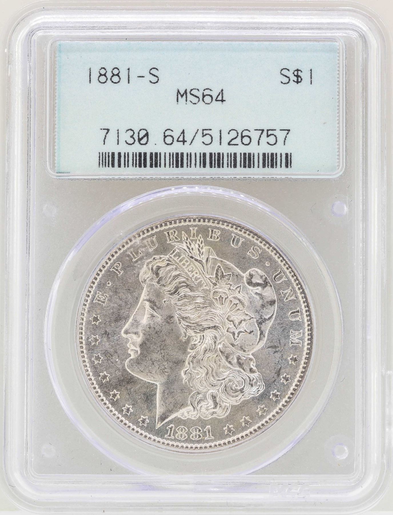 One 1881-S $1 Morgan Silver Dollar Coin PCGS MS64.