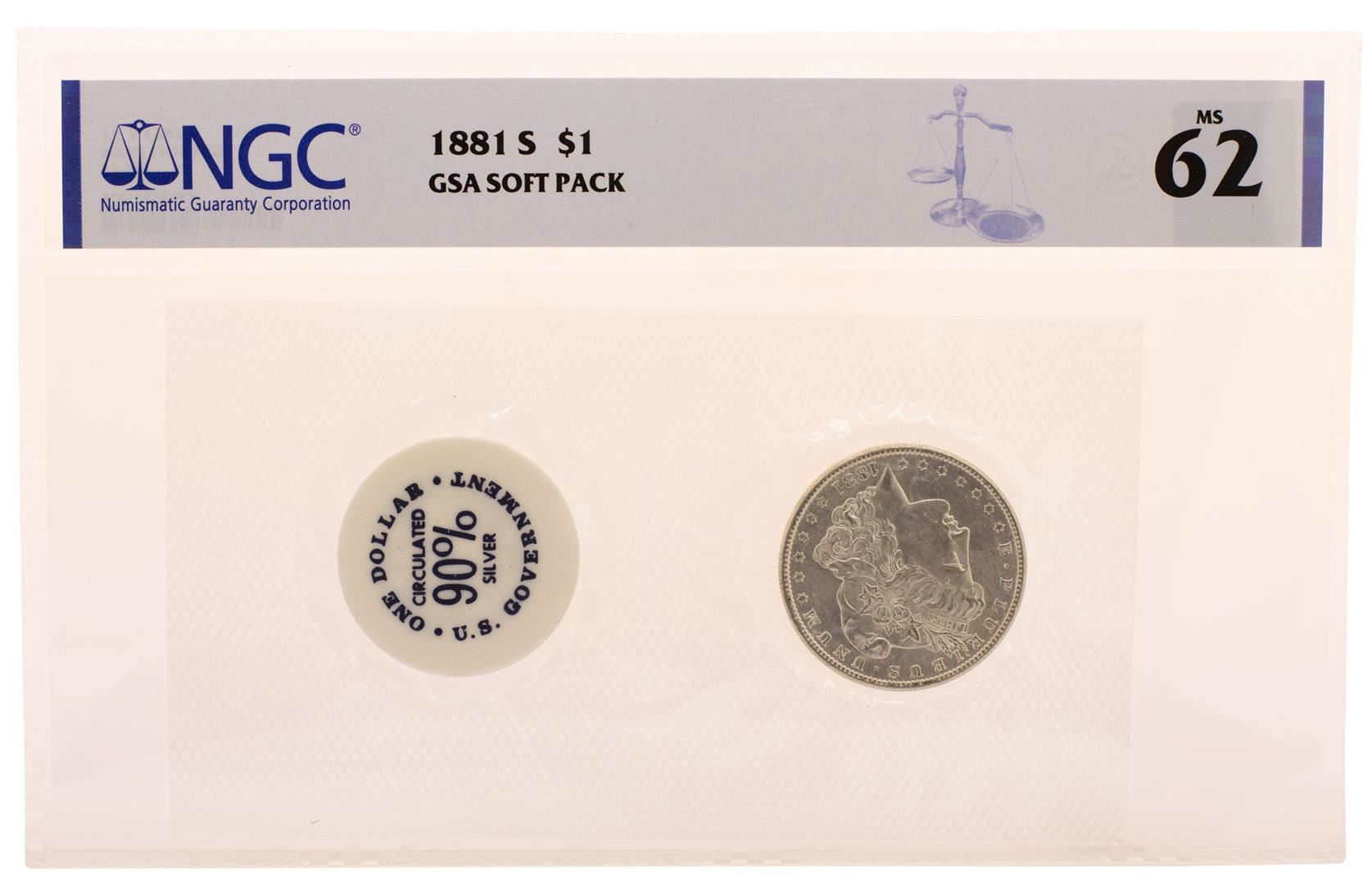 One 1881-S $1 Morgan Silver Dollar Coin with GSA Soft Pack NGC MS62.