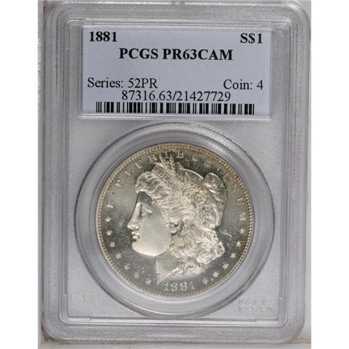 <B>1881 S$1 PR63 Cameo PCGS.</B></I> One of just 984 specimens coined, this Select Proof has light golden toning over deeply reflective surfaces. Light contact marks are scattered around the frosted devices. Population: 5 in 63 Cameo, 28 finer (10/06).<BR><BR><b>Shipping:</b> Coin/Currency (<a target="_blank" href="http://www.heritageauctions.com/common/shipping.php">view shipping information</a>)