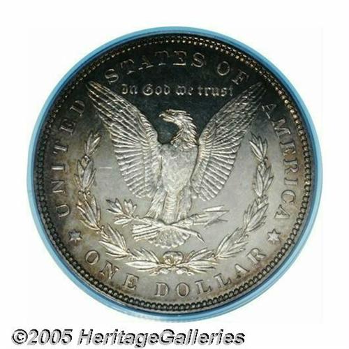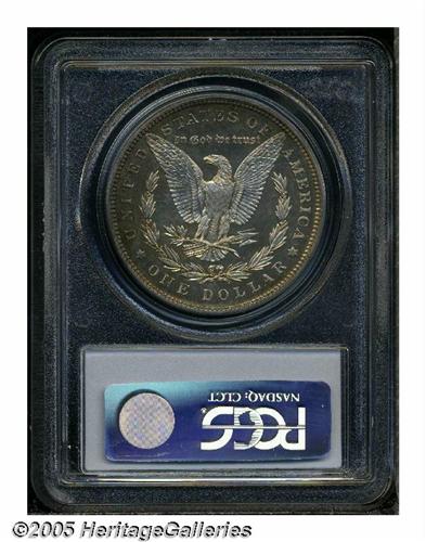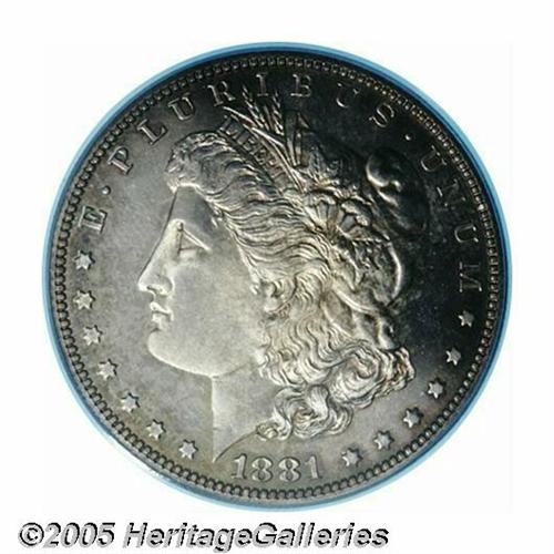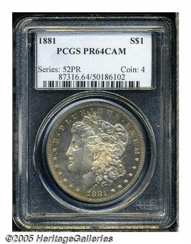 <B>1881<S$1> PR64 Cameo PCGS.</B></I> One of only 984 proofs struck in this year. That survivors appear rather infrequently on the market is evident from a review of auction records which indicate only seven appearances through the major auction houses over the past five or so years. The Near Gem offered here displays light golden-brown speckles over the obverse, while the reverse coloration is a shade deeper and includes whispers of cobalt-blue and lilac around the periphery. Deeply mirrored fields offer a noticeable contrast with the mildly frosted motifs. The design elements are sharply struck, and the surfaces are devoid of mentionable abrasions. A few wispy slide marks are noted on Liberty's cheek. Population: 13 in 64 Cameo, 11 finer (4/05).