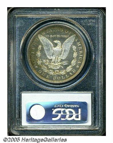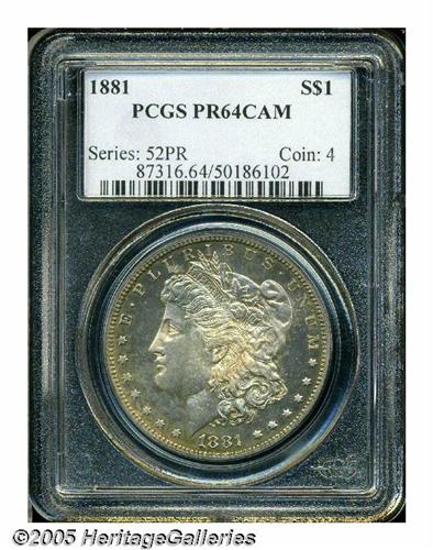<B>1881<S$1> PR64 Cameo PCGS.</B></I> One of only 984 proofs struck in this year. That survivors appear rather infrequently on the market is evident from a review of auction records which indicate only seven appearances through the major auction houses over the past five or so years. The Near Gem offered here displays light golden-brown speckles over the obverse, while the reverse coloration is a shade deeper and includes whispers of cobalt-blue and lilac around the periphery. Deeply mirrored fields offer a noticeable contrast with the mildly frosted motifs. The design elements are sharply struck, and the surfaces are devoid of mentionable abrasions. A few wispy slide marks are noted on Liberty's cheek. Population: 13 in 64, 11 finer (5/05).